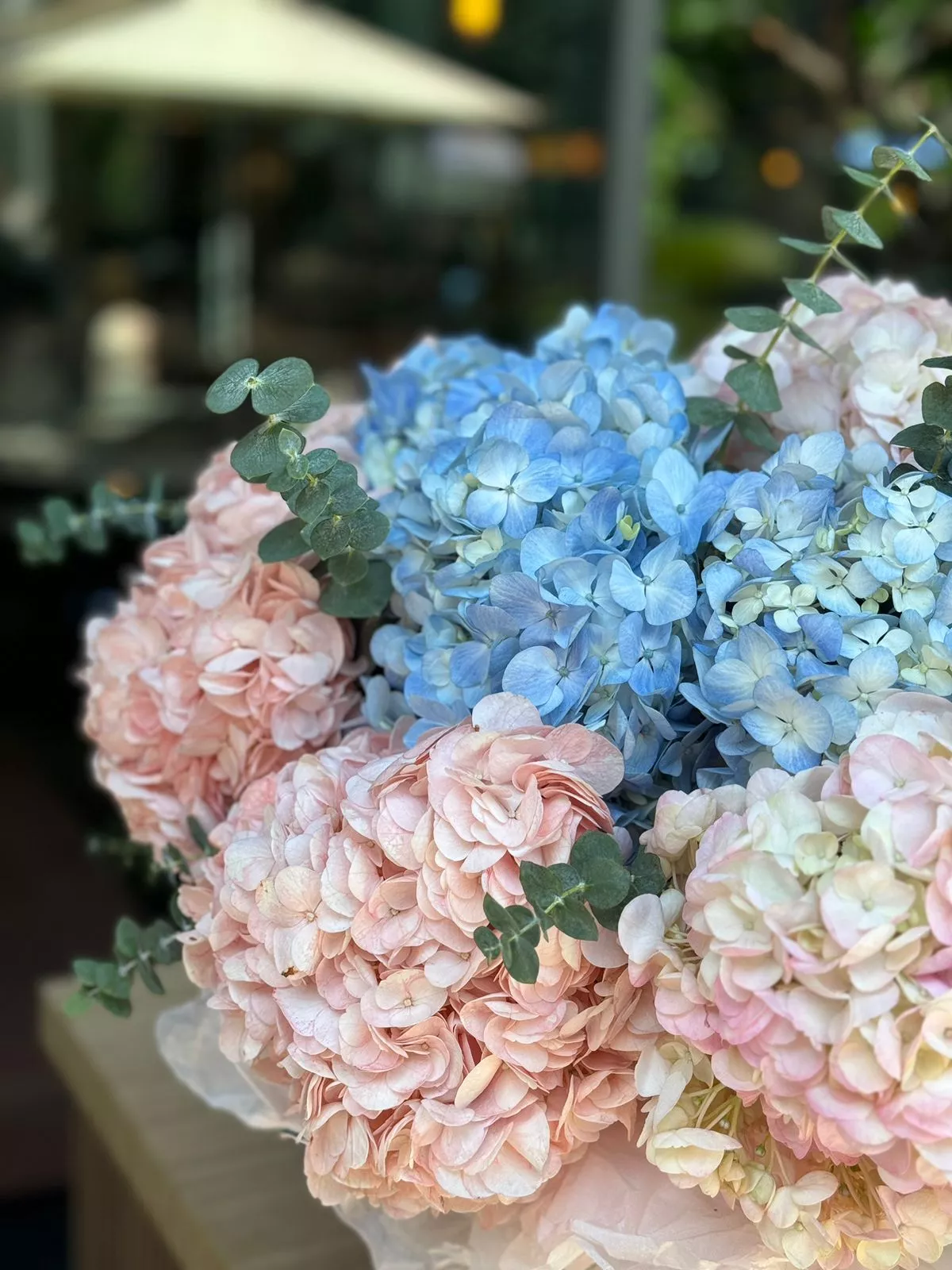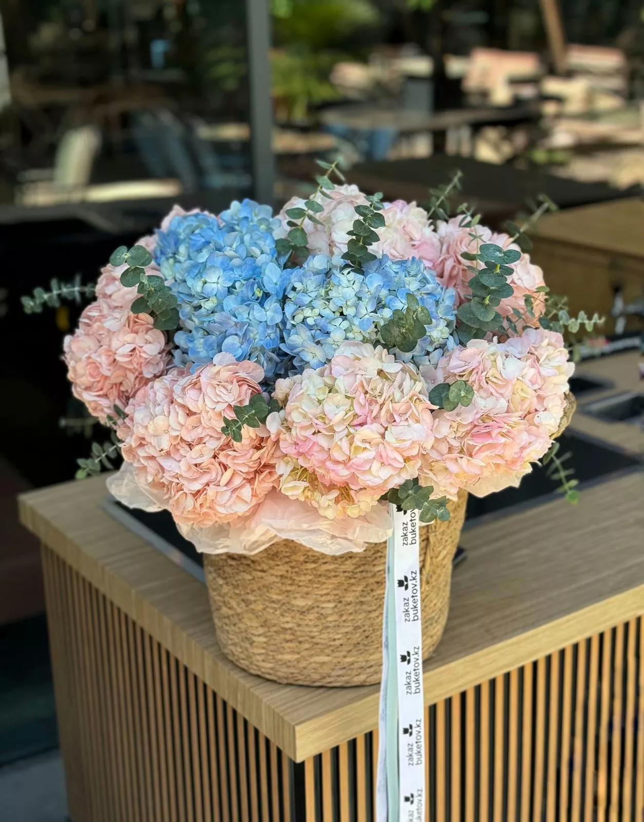 Композиция гортензии и эвкалипта в кашпо создаёт яркое и стильное украшение для вашего интерьера или сада. Нежное сочетание пышных соцветий гортензии и благородных листьев эвкалипта добавляет изысканности и свежести в любую обстановку.