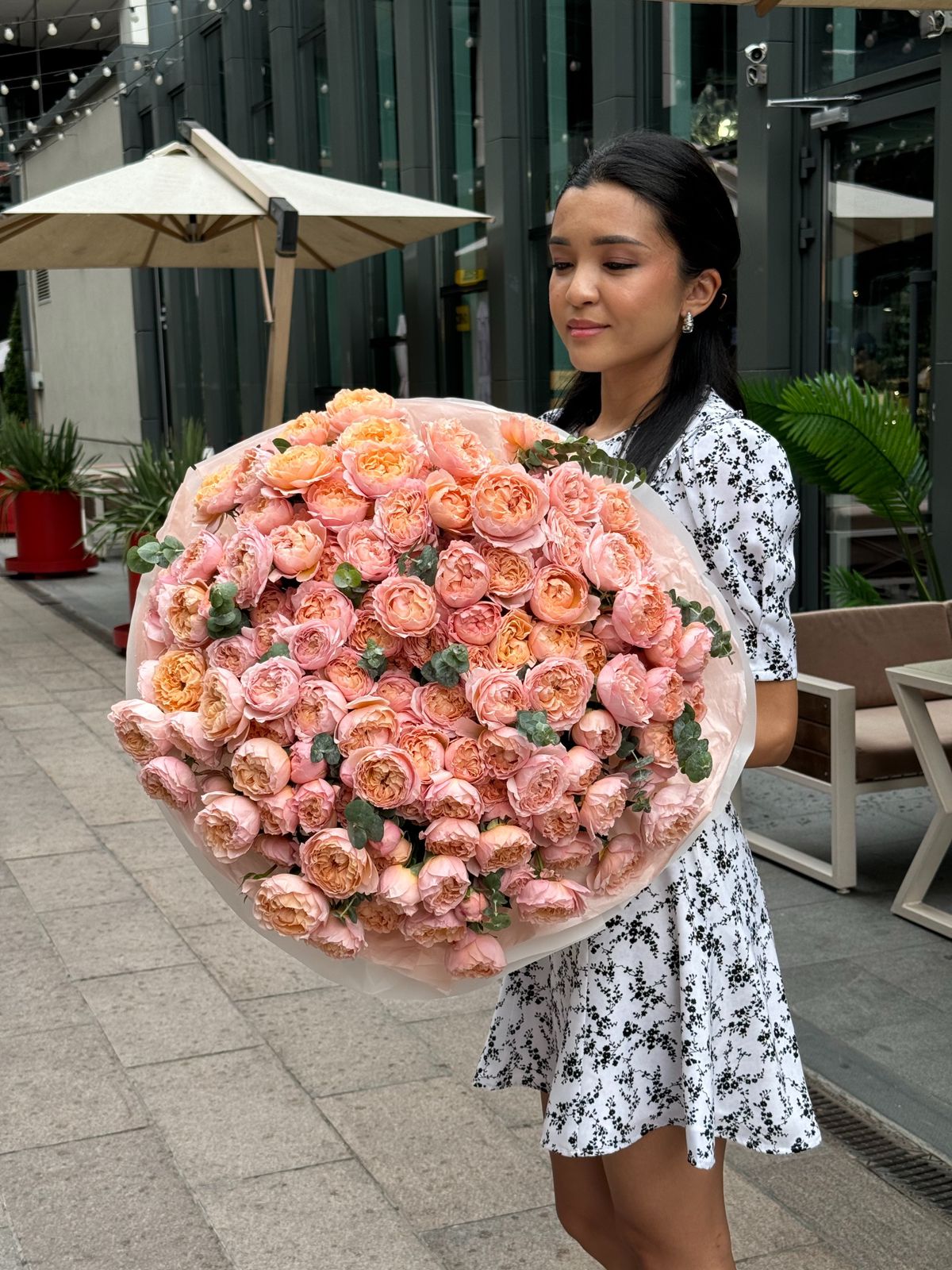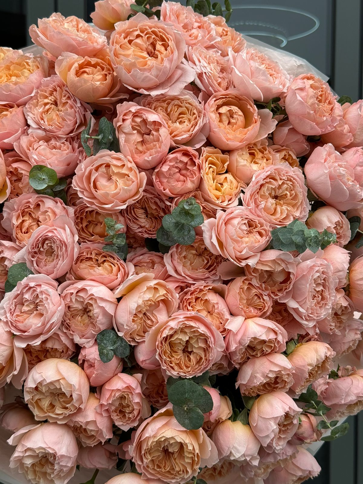 Букет из пионовидных спрей-роз и эвкалипта — это изысканное сочетание нежности пионовидных бутонов и свежести эвкалипта. Этот букет станет прекрасным подарком на любое торжество и будет радовать своей красотой и ароматом долгое время.