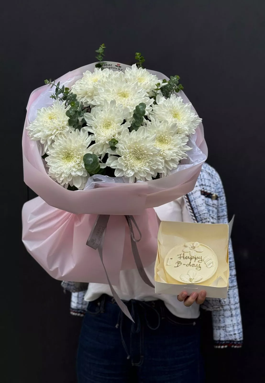 Букет из хризантем и бенто-торт — это стильный и оригинальный подарок, сочетающий красоту живых цветов и вкусный десерт.