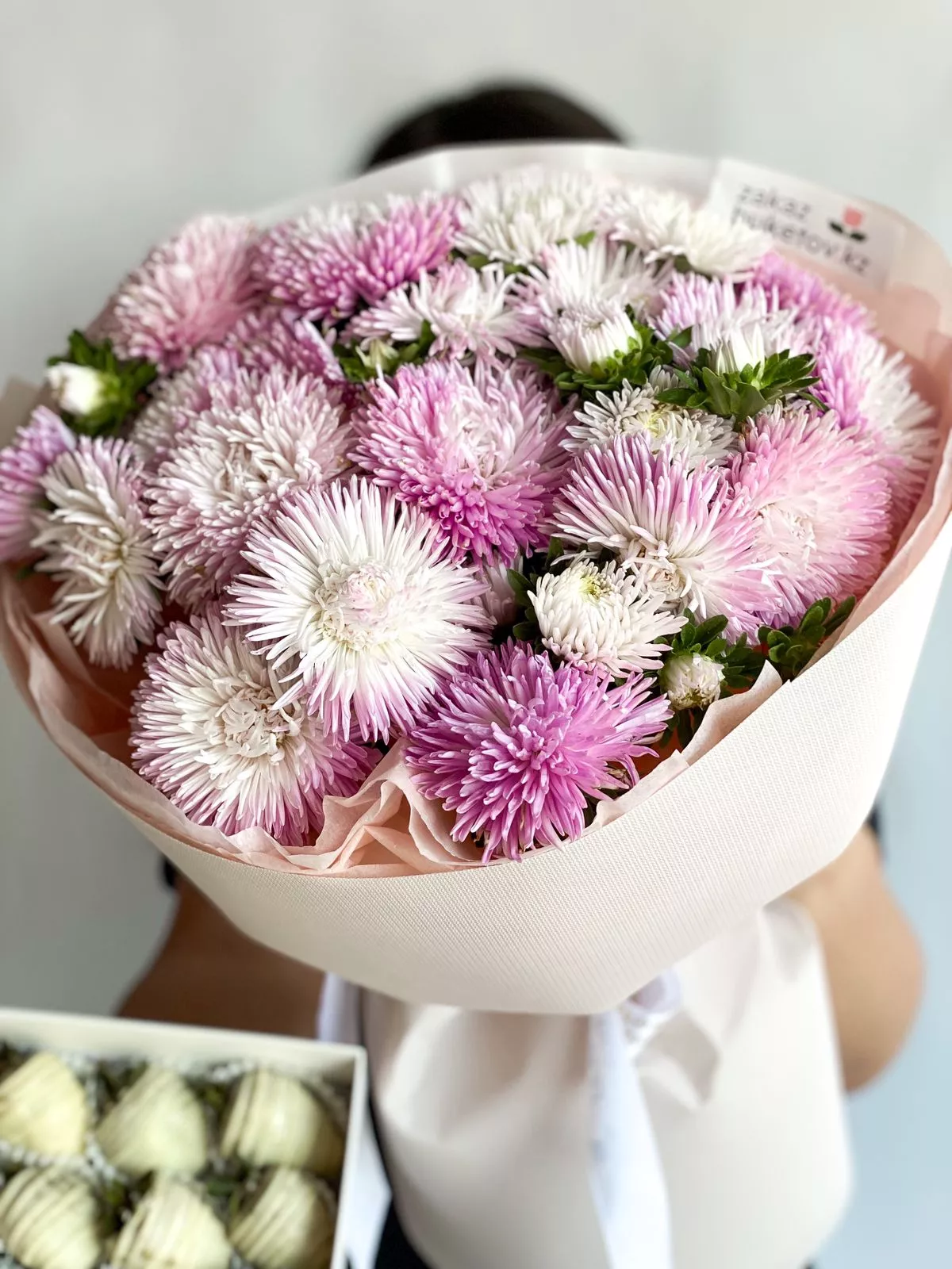 Букет из астр и фруктов в шоколаде — будет радовать глаз и поднимать настроение.
