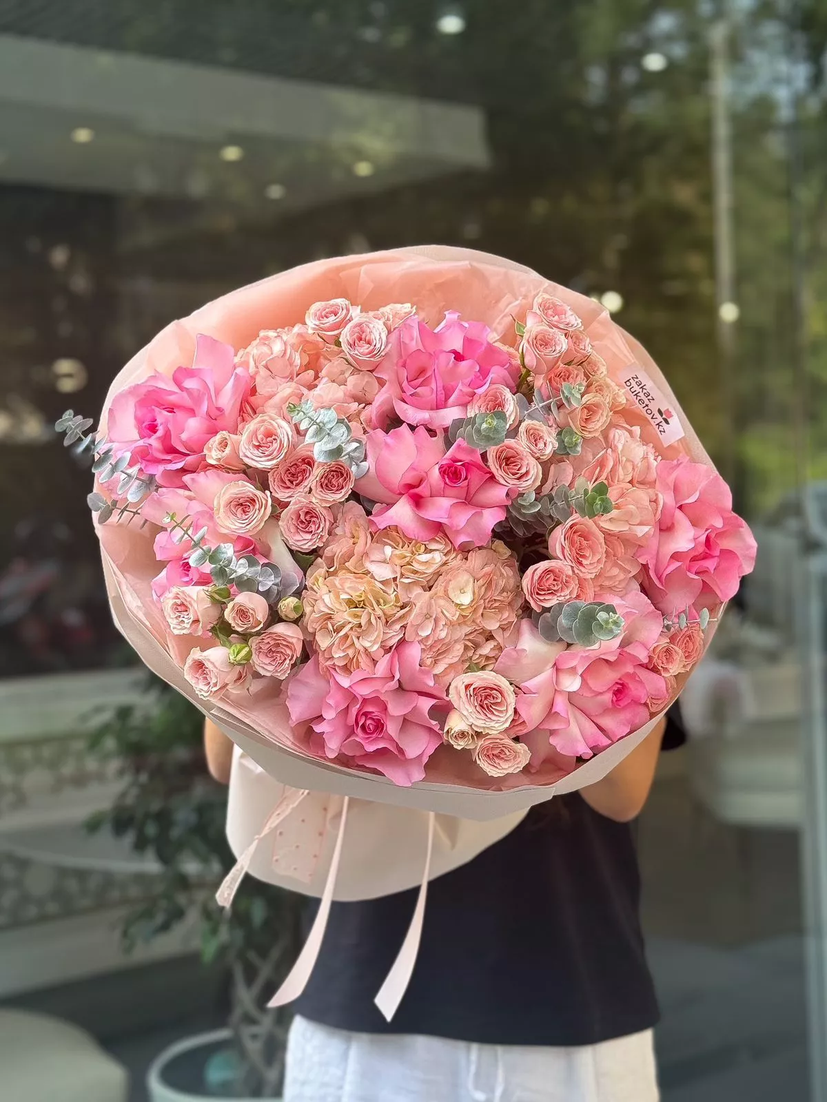 Гортензия (Колумбия) - 3; Эвкалипт (Голландия) - 1; Роза голландская 60 см - 7; Спрей роза (Кения) - 10; Калька в ассортименте - 4; Открытка - 1;