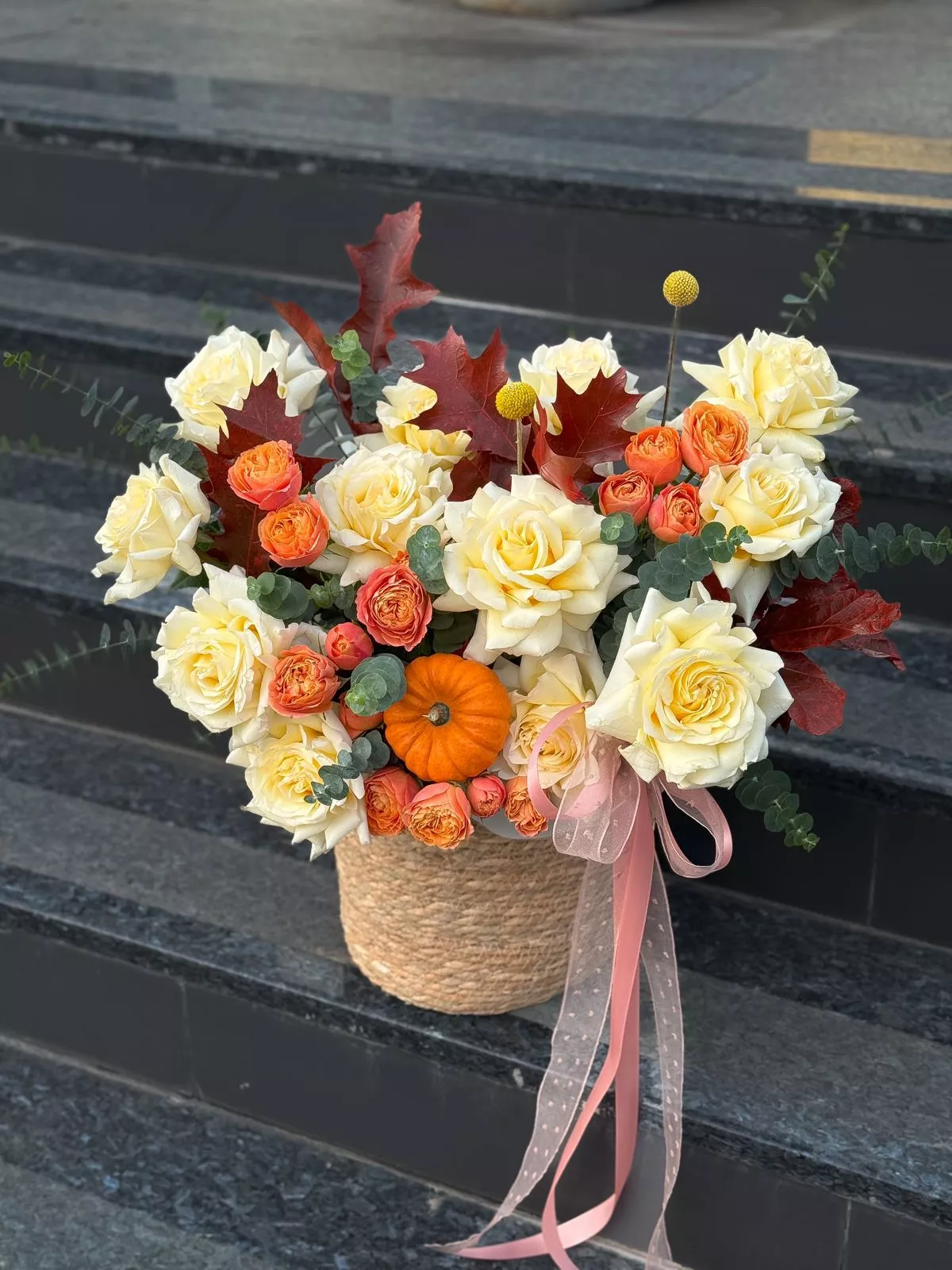 Композиция «Элоди» состоит из роз, кукурбиты и осенних листьев. Этот букет станет прекрасным подарком и создаст атмосферу уюта и тепла.