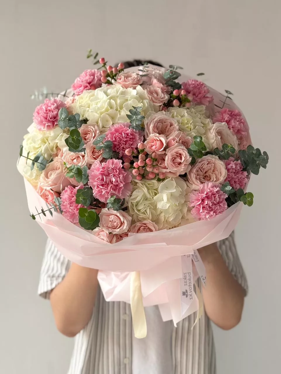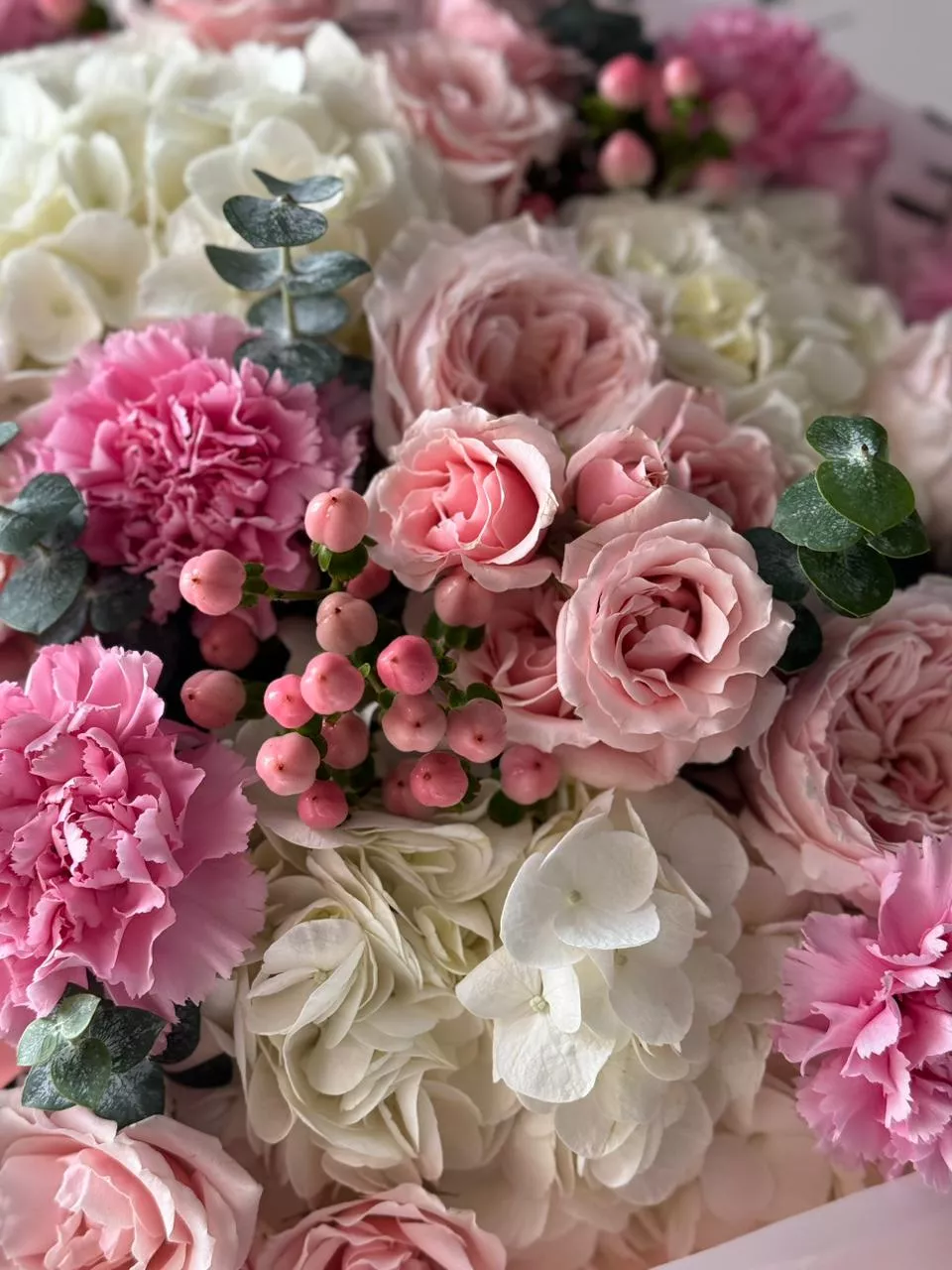 Букет из гортензий, гвоздик и роз — это нежное сочетание пышных розовых бутонов, ярких гвоздик и воздушных гортензий. Такой букет станет прекрасным подарком на любой праздник и подчеркнёт вашу любовь и заботу.