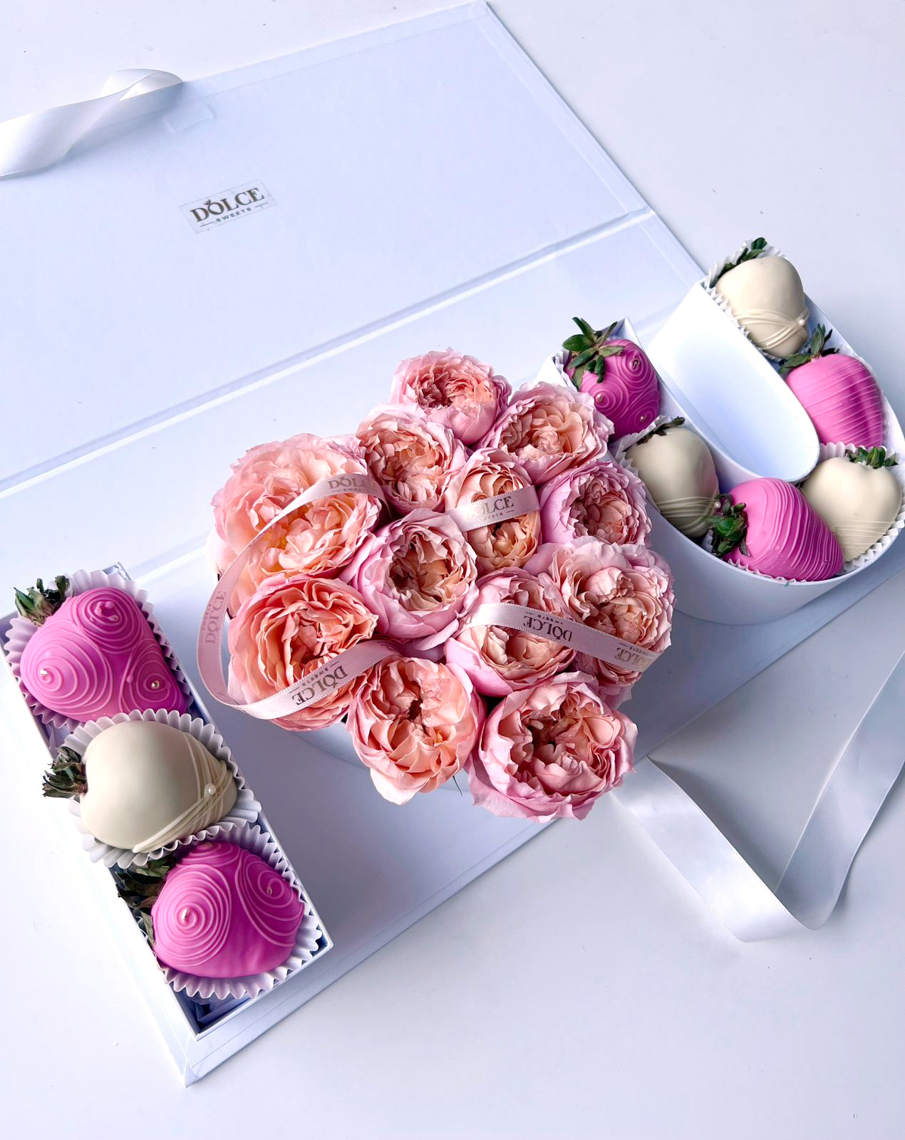 Сочная клубника, погруженная в нежный шоколад, встречает вас в белой коробке в компании с бутонами пионовидных роз, чтобы подчеркнуть вашу нежность и внимание к особенному человеку.