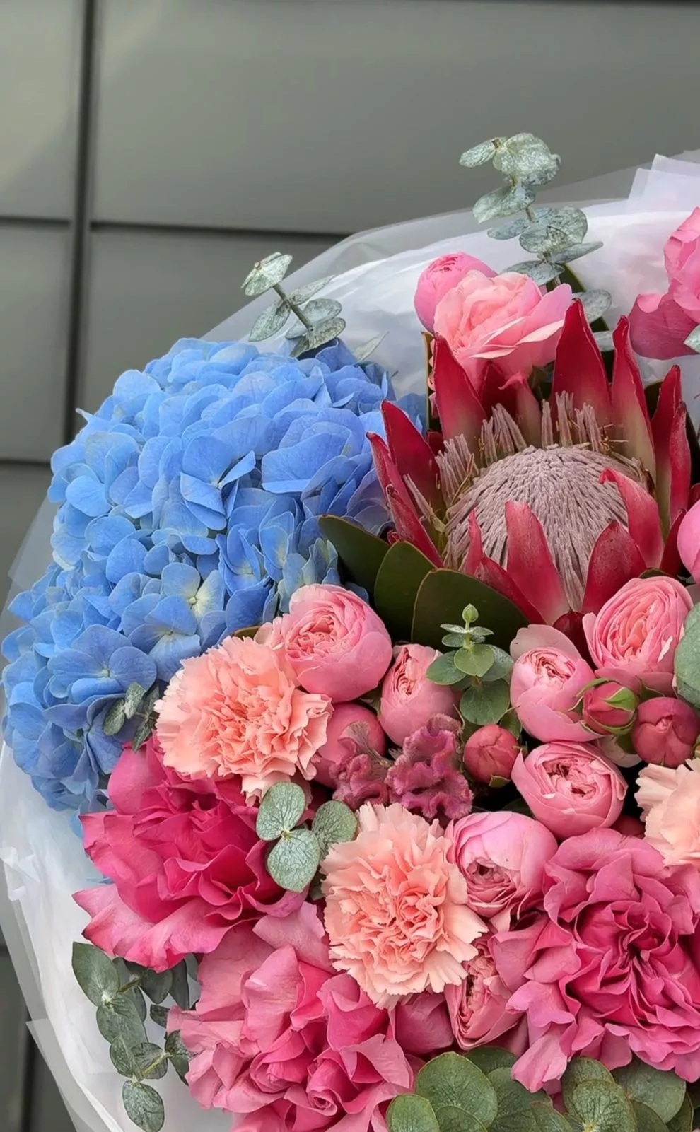 Букет из гортензий, гвоздик, роз и протеи — это яркая и стильная композиция, которая подойдёт для любого случая. В ней сочетаются нежность гвоздик, роскошь роз и экзотика протеи, создавая неповторимый образ.
