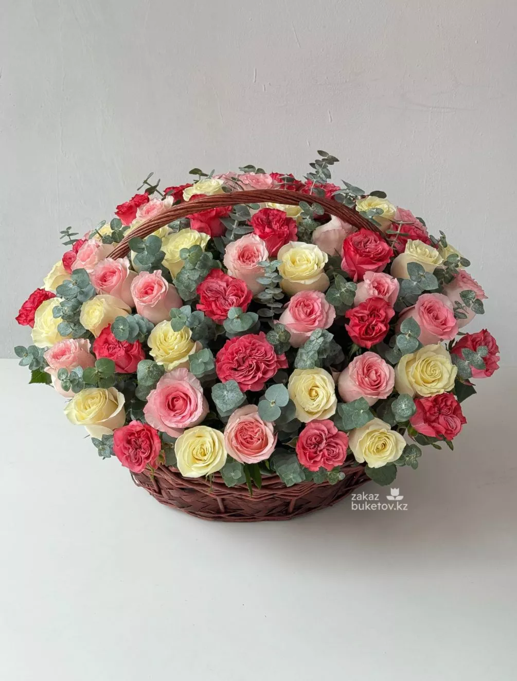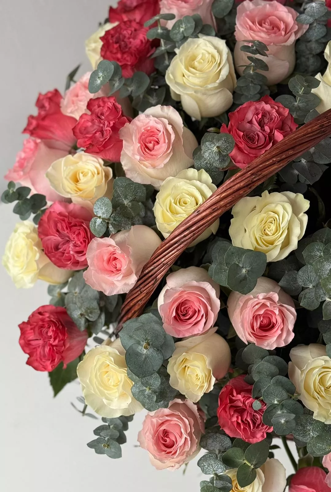 Это роскошный подарок, который станет незабываемым сюрпризом для любого человека. В корзине вы найдёте 65 свежих и ярких роз разных оттенков, которые символизируют любовь, радость и счастье. Эвкалипт добавляет особую нотку экзотики и свежести, создавая неповторимую атмосферу праздника. Эта композиция станет прекрасным украшением любого интерьера и подарит незабываемые эмоции.
