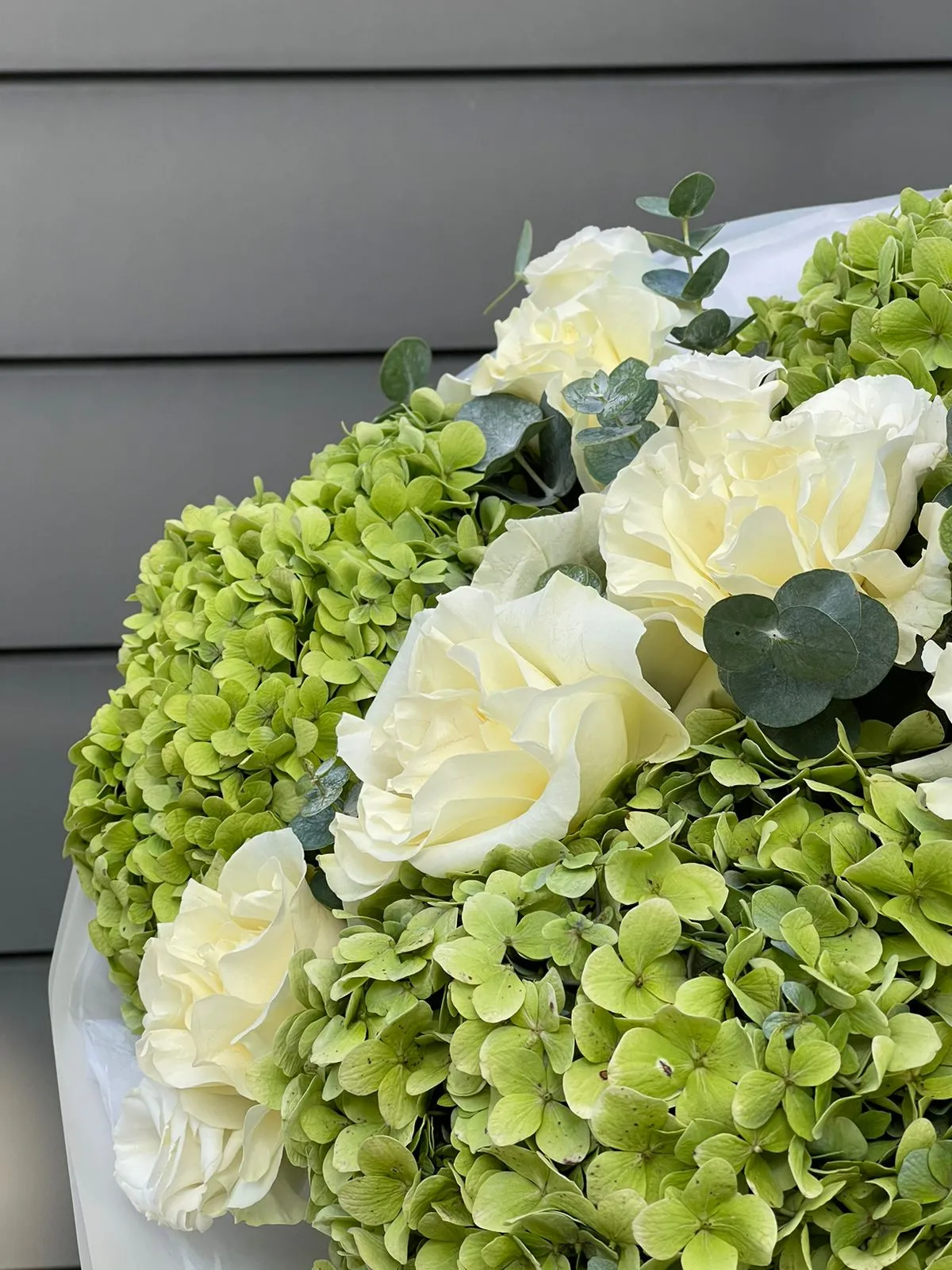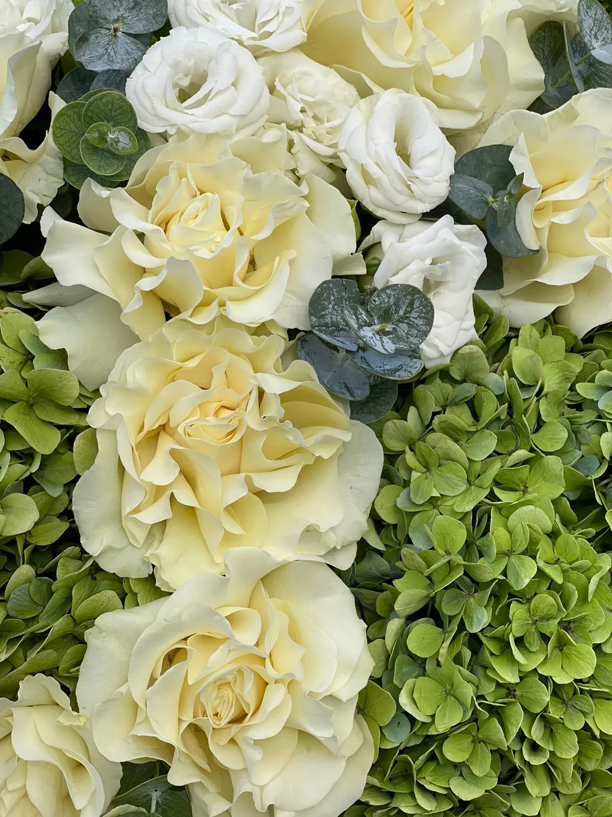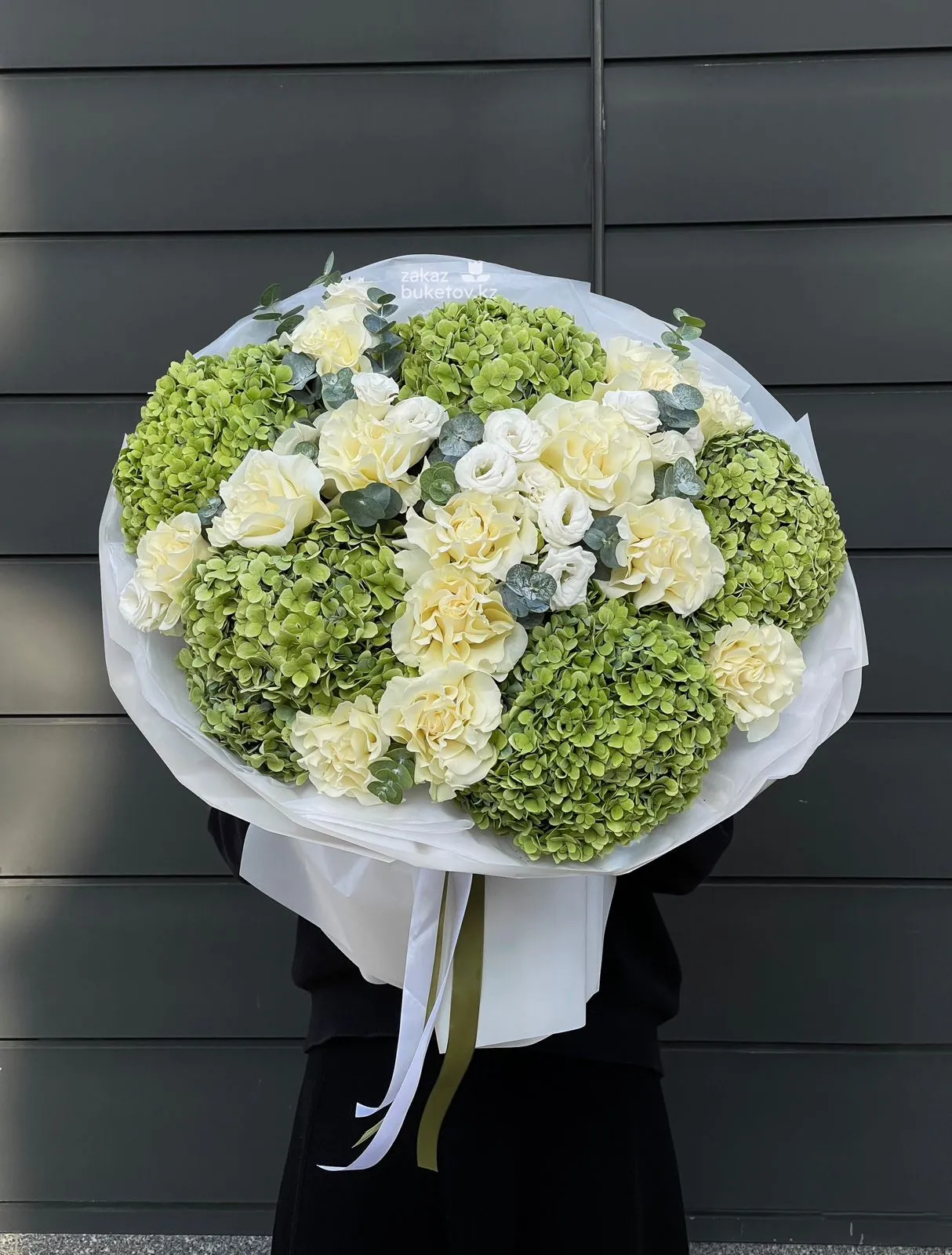 Композиция из роз, лизиантусов и зелёных гортензий — это изысканное сочетание нежности и страсти, романтики и элегантности. Зелёные гортензии добавляют свежести и яркости, создавая неповторимый контраст с яркими цветами роз и лизиантусов.