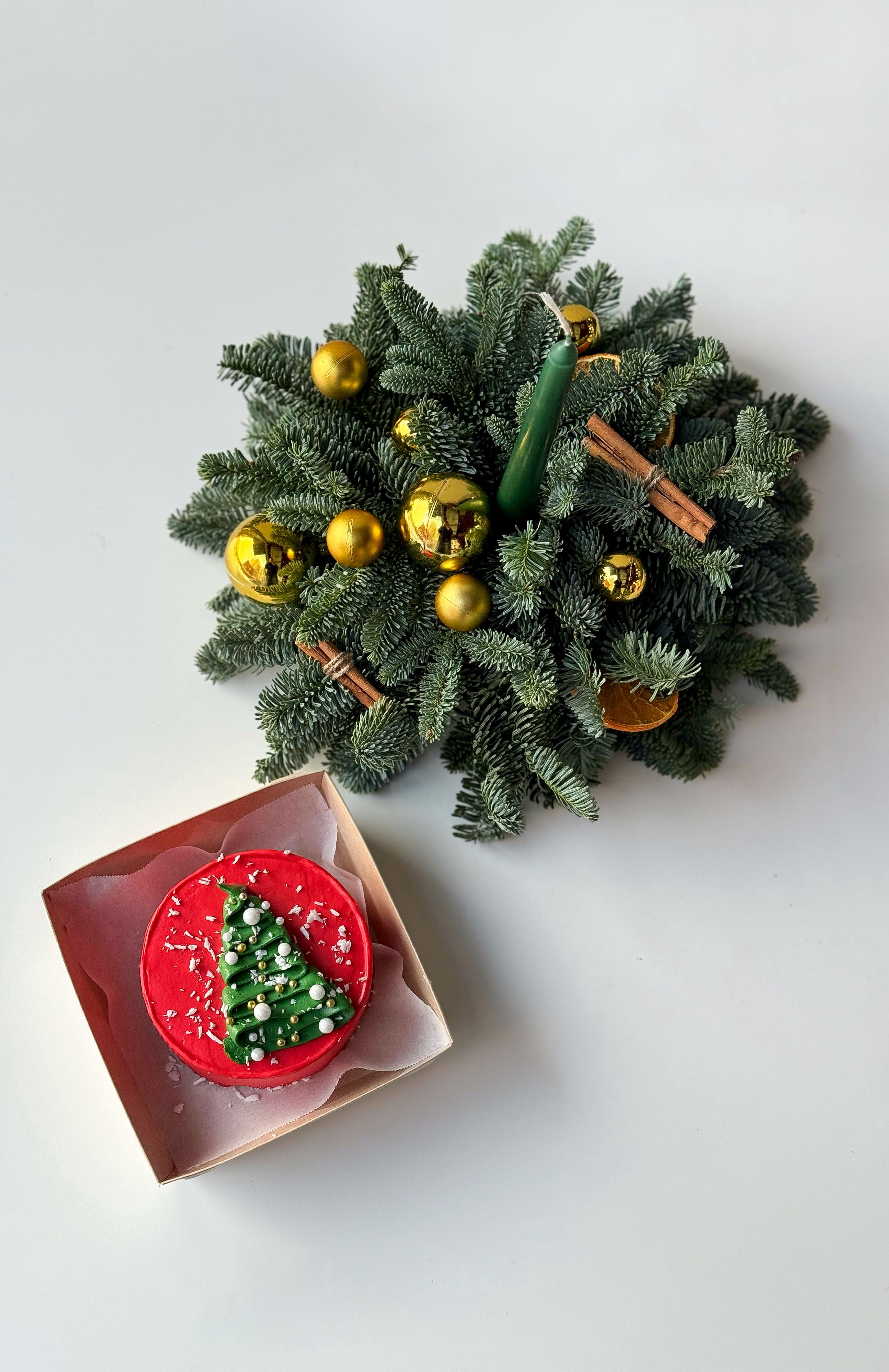 Сет «Emerald» — это тёплая зимняя композиция, созданная для тех, кто любит атмосферу праздника во всех её деталях. Нежная хвоя нобилиса раскрывает глубину аромата, а сушёные апельсины и корица добавляют уютные нотки домашнего тепла. Античная свеча создаёт мягкое свечение, а новогодние игрушки вносят тот самый праздничный блеск. В составе также индивидуальный бенто-торт S — аккуратный, стильный и вкусный элемент, который делает подарок не только красивым, но и по-настоящему сладким. Такой сет — идеальное решение, чтобы поздравить близкого человека, украсить дом и подарить ощущение волшебства.