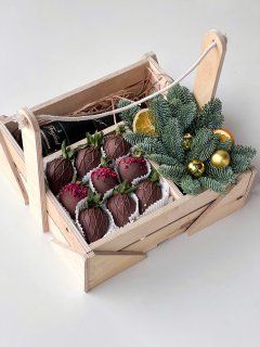 Клубника в шоколаде - 9; Нобилис (Голландия) - 0.5; Апельсины (сушеные) - 2; Новогодняя игрушка - 3; Ящик деревянный с ручкой - 1; Мини шампанское - 1; Открытка - 1;