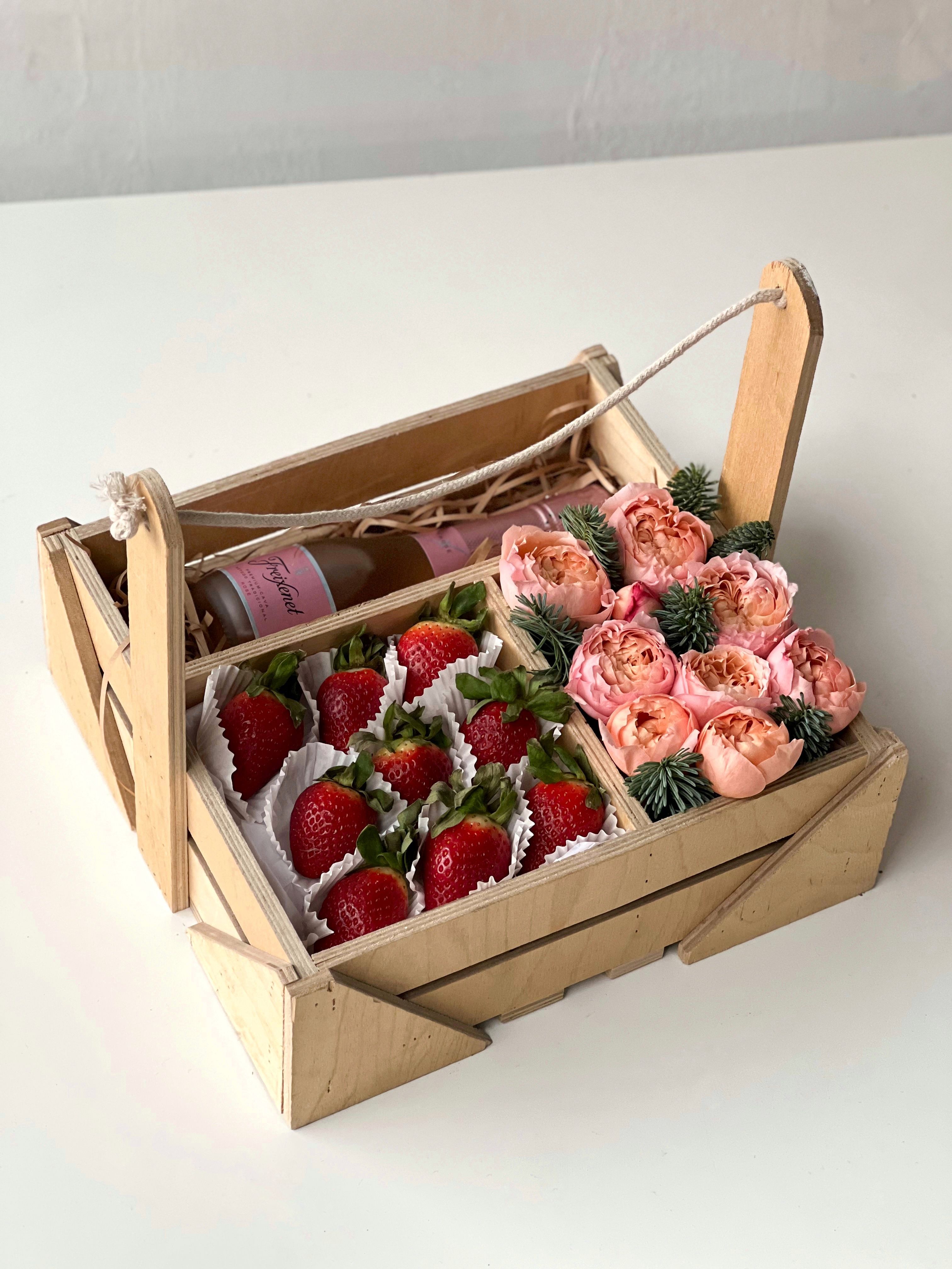 Клубника без шоколада - 9; Спрей роза пионовидная (Кения) - 2; Нобилис (Голландия) - 0.25; Мини шампанское - 1; Открытка - 1; Ящик деревянный с ручкой - 1;