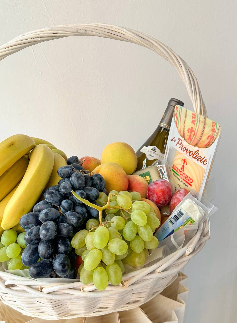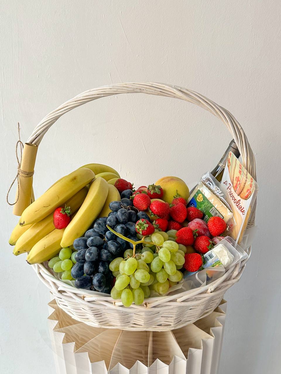 Шикарная премиальная корзина "Свидание" с ягодами, фруктами, вином и тремя видами сыра идеально для романтичного незабываемого свидания.