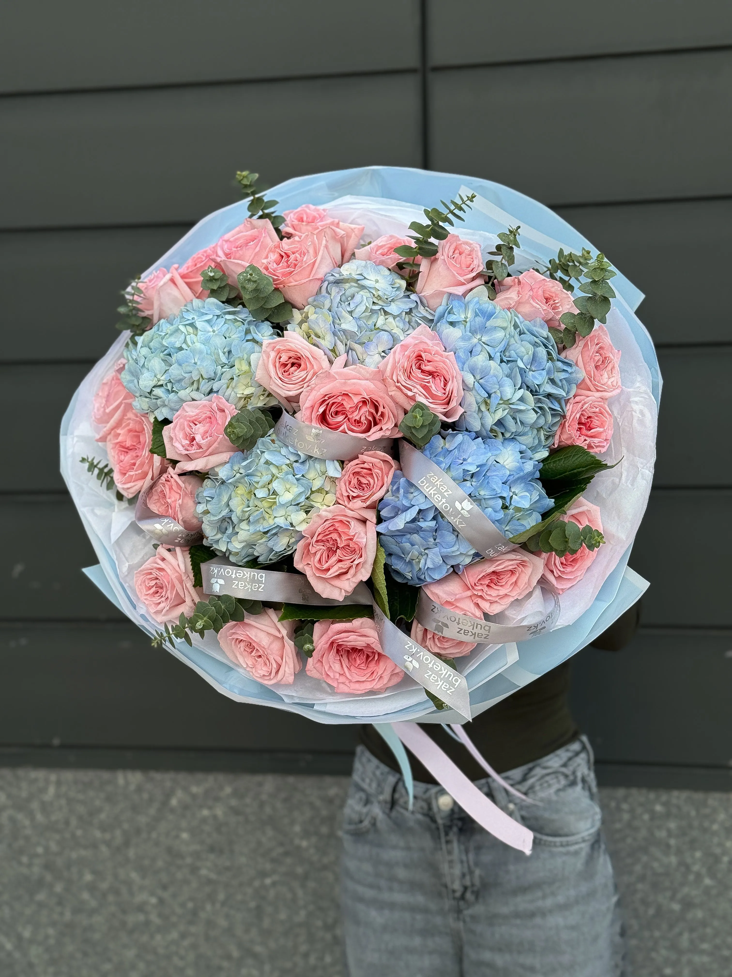 Букет "Пикассо" с охарой — яркая и гармоничная композиция из нежно-розовых роз, воздушной голубой гортензии и утончённой охары. Этот букет словно живописное полотно, где каждый цветок — мазок художника, создающий образ лёгкости, нежности и утончённого стиля.