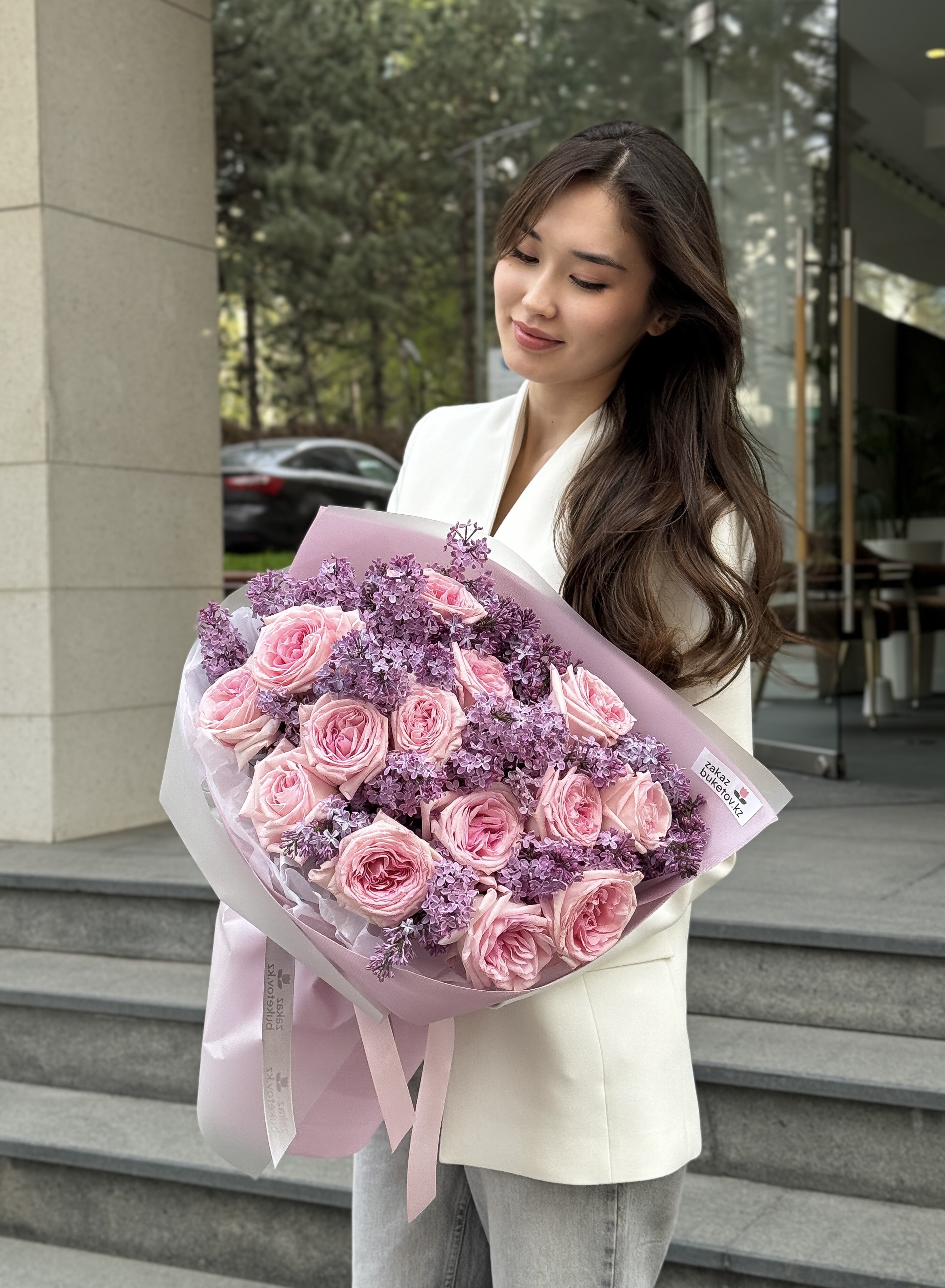 Роза Охара 60 см - 15; Сирень местная (пучок) - 2; Калька в ассортименте - 4; Открытка - 1;