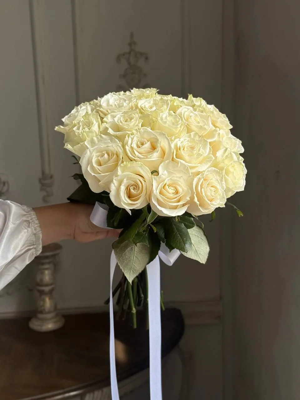 Свадебный букет «Крессида» — утончённая классика из кремовых роз, символизирующих нежность и чистоту чувств. Идеально собранный купол из свежих бутонов подчеркнёт изысканность образа невесты, а белоснежная лента добавит утончённый штрих.