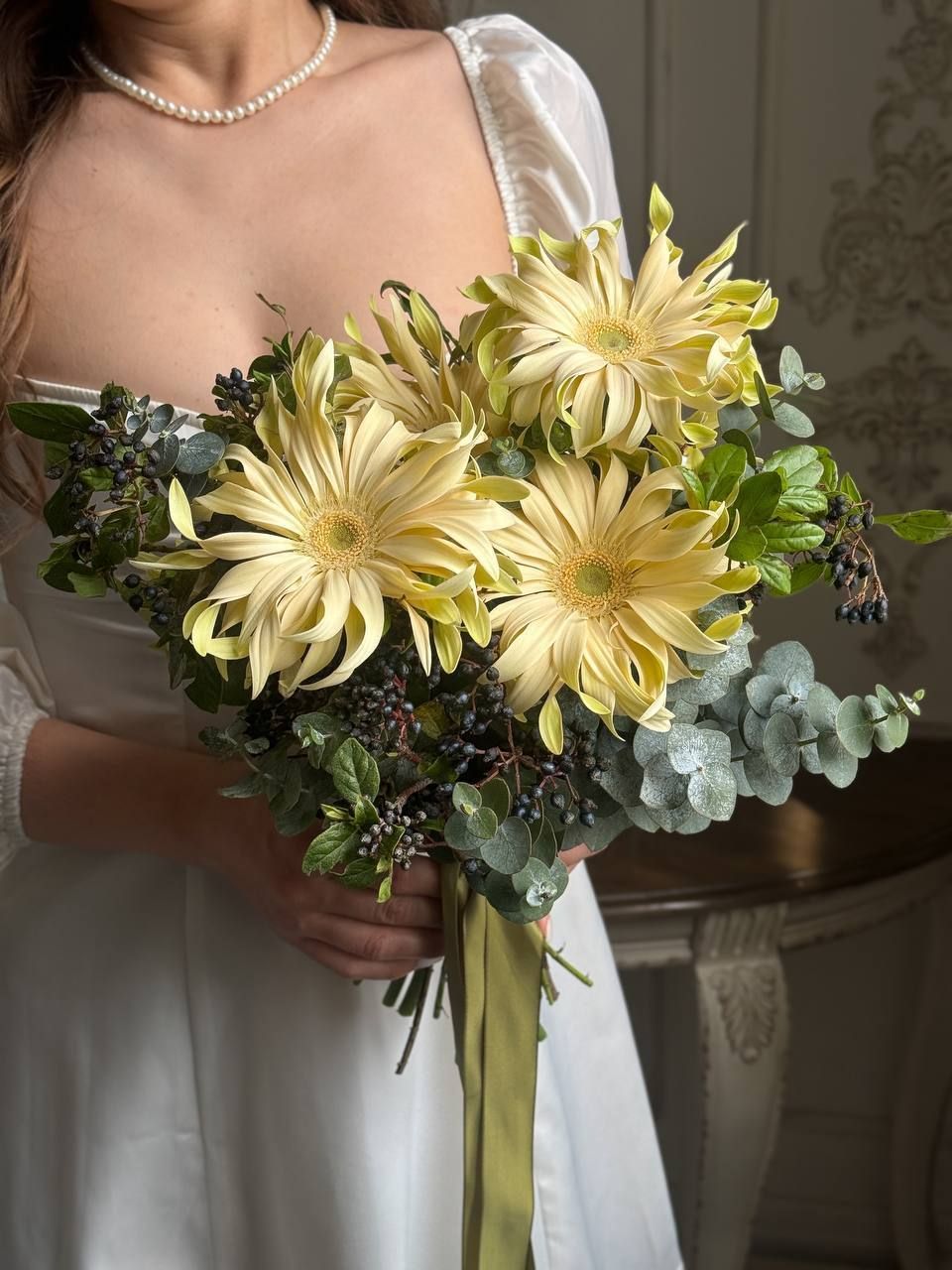 Свадебный букет «Эдвина» — утончённая композиция из нежных лимонно-жёлтых гербер с добавлением зелени эвкалипта и акцентов из тёмных ягод. Яркий и в то же время изысканный, он станет оригинальным штрихом в образе невесты, добавив лёгкость и индивидуальность.
