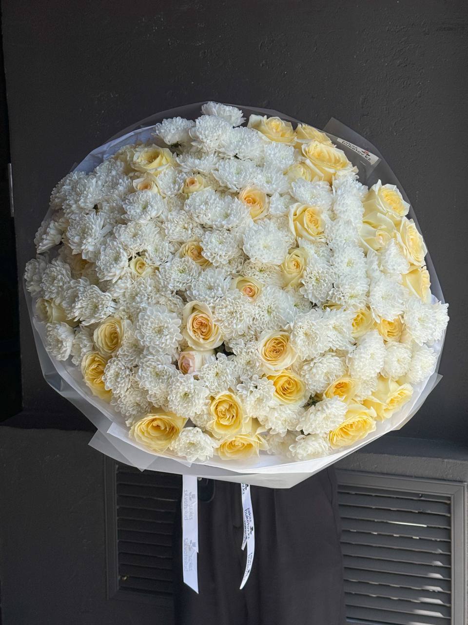 Букет «Позитано» — утончённое сочетание кремово-жёлтых роз и пышных белоснежных хризантем.