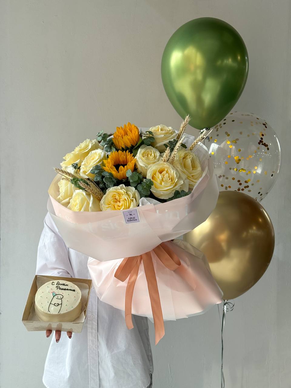 Шикарный букет из золотистых роз и солнечных подсолнухов, дополненный свежей зеленью и колосками, олицетворяет тепло, радость и энергию лета. Нежный мини-торт с милой надписью и воздушные шары в золотых и зелёных тонах делают этот сет идеальным для особого праздника.