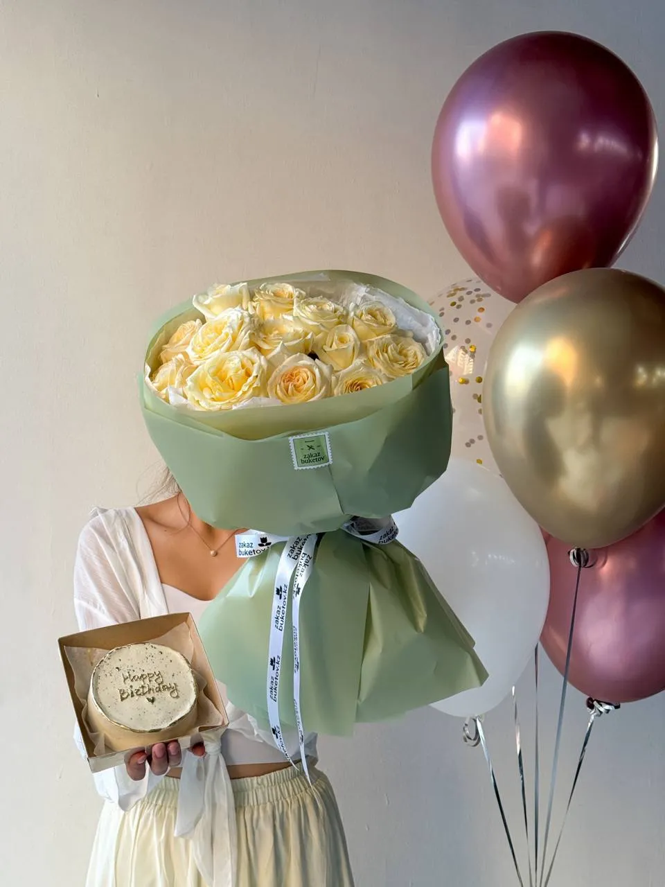 Сет «Кэнди» с шарами — это готовый подарок, который произведёт вау-эффект с первого взгляда. В него входит букет нежных кремово-жёлтых роз в стильной упаковке, набор воздушных шаров (металлизированные, прозрачный с конфетти и белый) и мини-торт с надписью Happy Birthday в индивидуальной коробочке. Такой сет идеально подойдёт для дня рождения, романтического сюрприза или любого праздника, когда хочется подарить радость и атмосферу торжества в одном наборе.