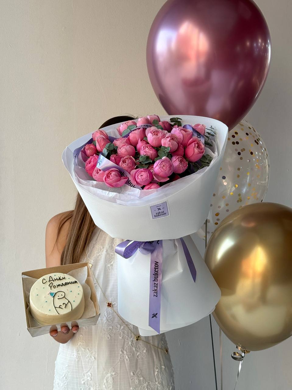 «Трепет любви» — изысканный букет пионовидных роз оттенка пудровой фуксии, в стильной упаковке с лавандовой лентой и авторским мини-тортом в комплекте.