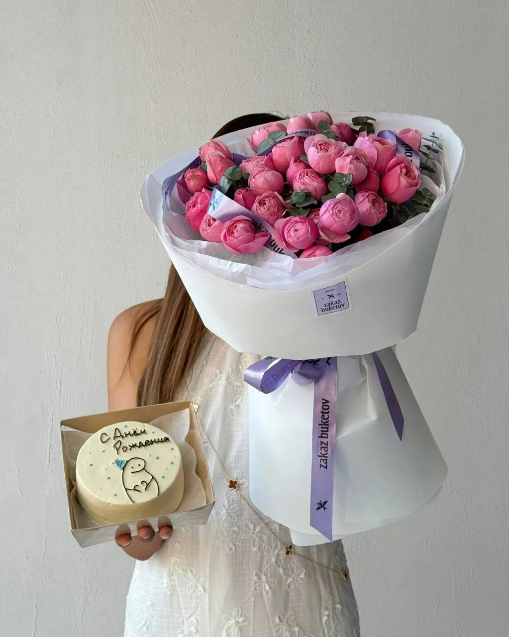 Пионовидные розы оттенка рассвета в обрамлении эвкалипта звучат как нежная симфония любви. А мини-торт с надписью «С Днём Рождения» добавляет этой композиции ещё больше уюта и праздника.