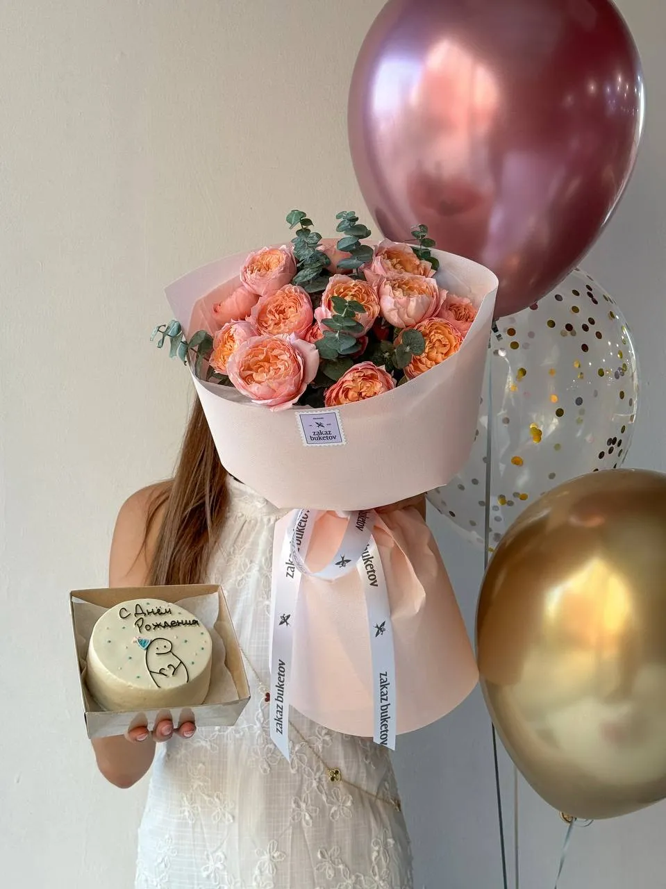 Персиковые розы с бархатными лепестками и ароматом утреннего солнца, в сочетании с эвкалиптом, воздушными шарами и мини-тортиком — идеальный подарок для души.
