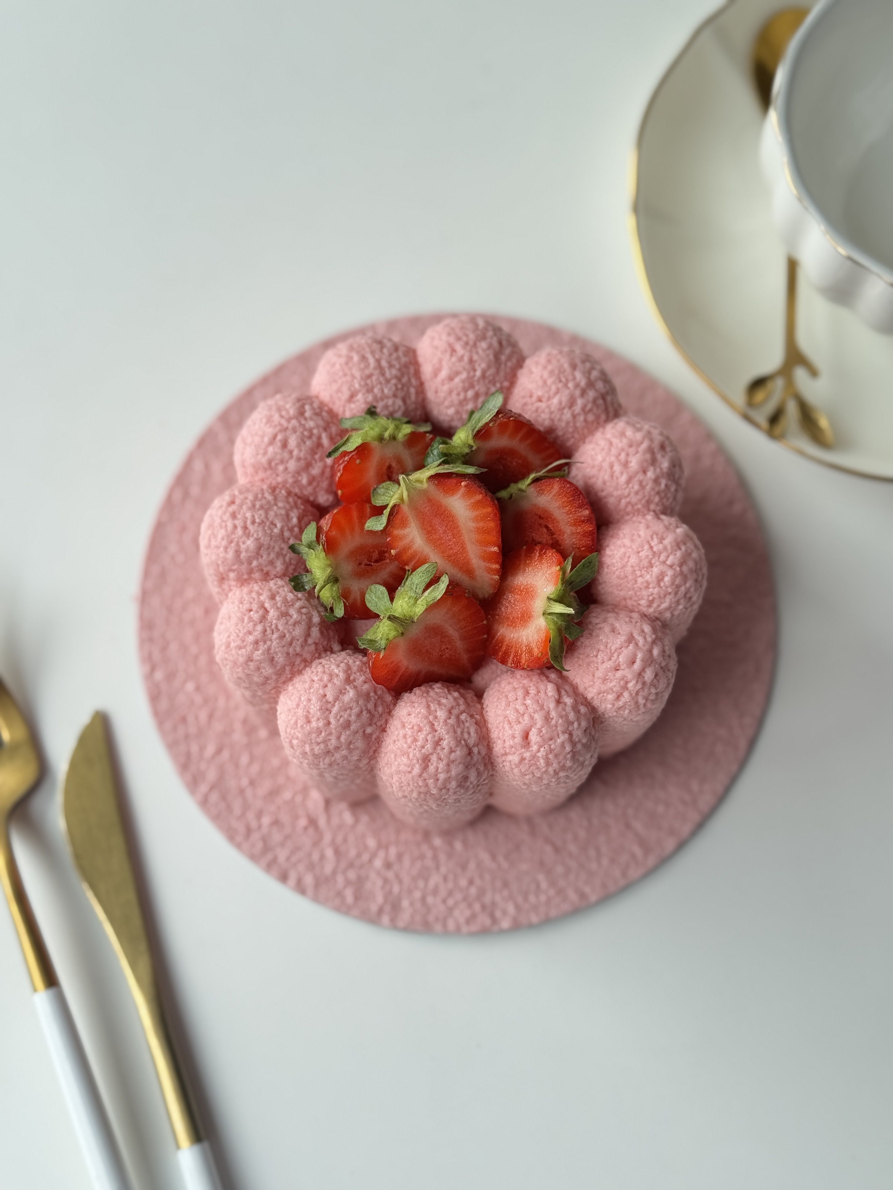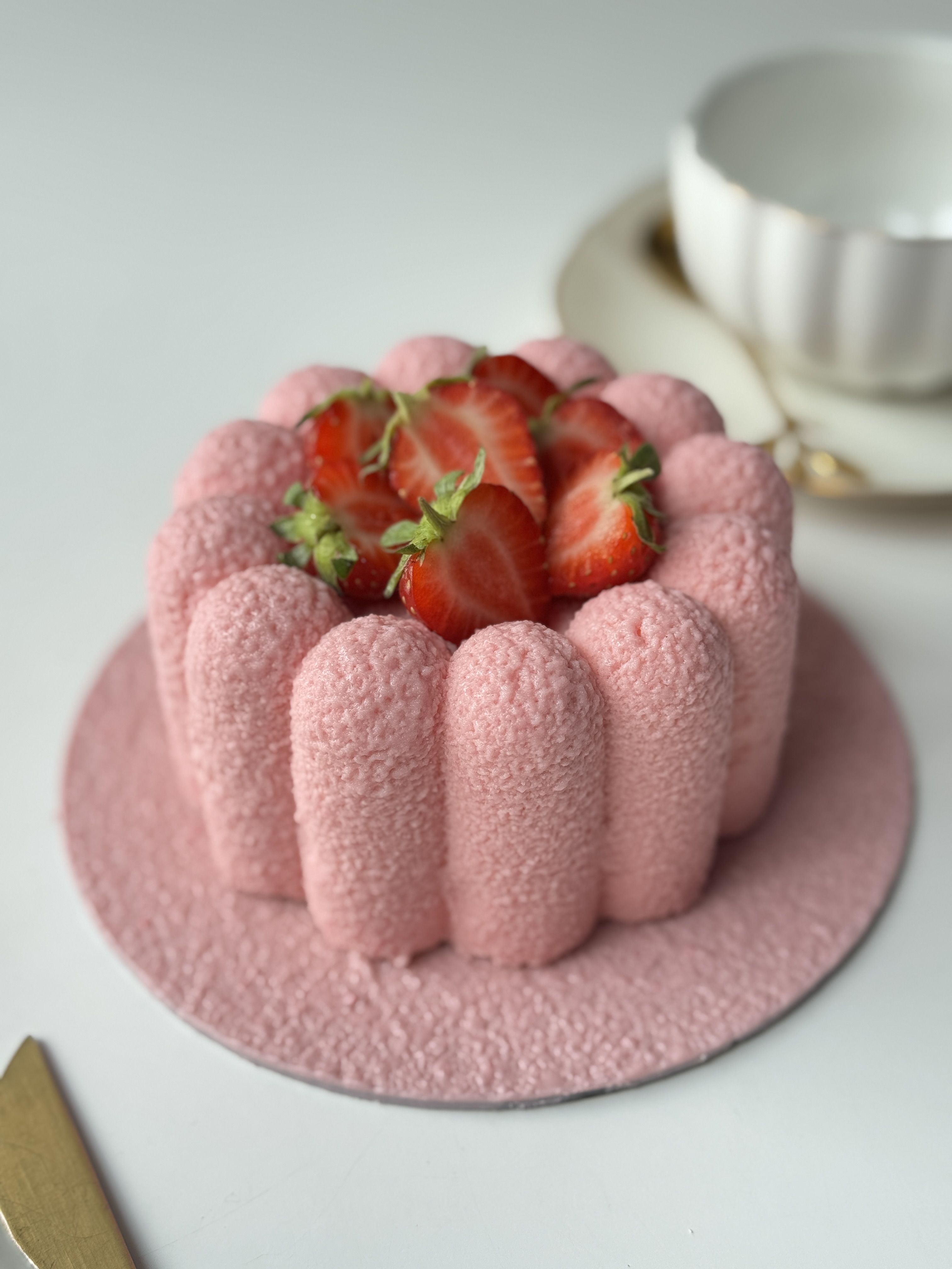 Воздушный муссовый торт с нежным розовым велюром, украшенный спелой клубникой. Лёгкая текстура, насыщенный ягодный вкус и эффектная подача для особых моментов.