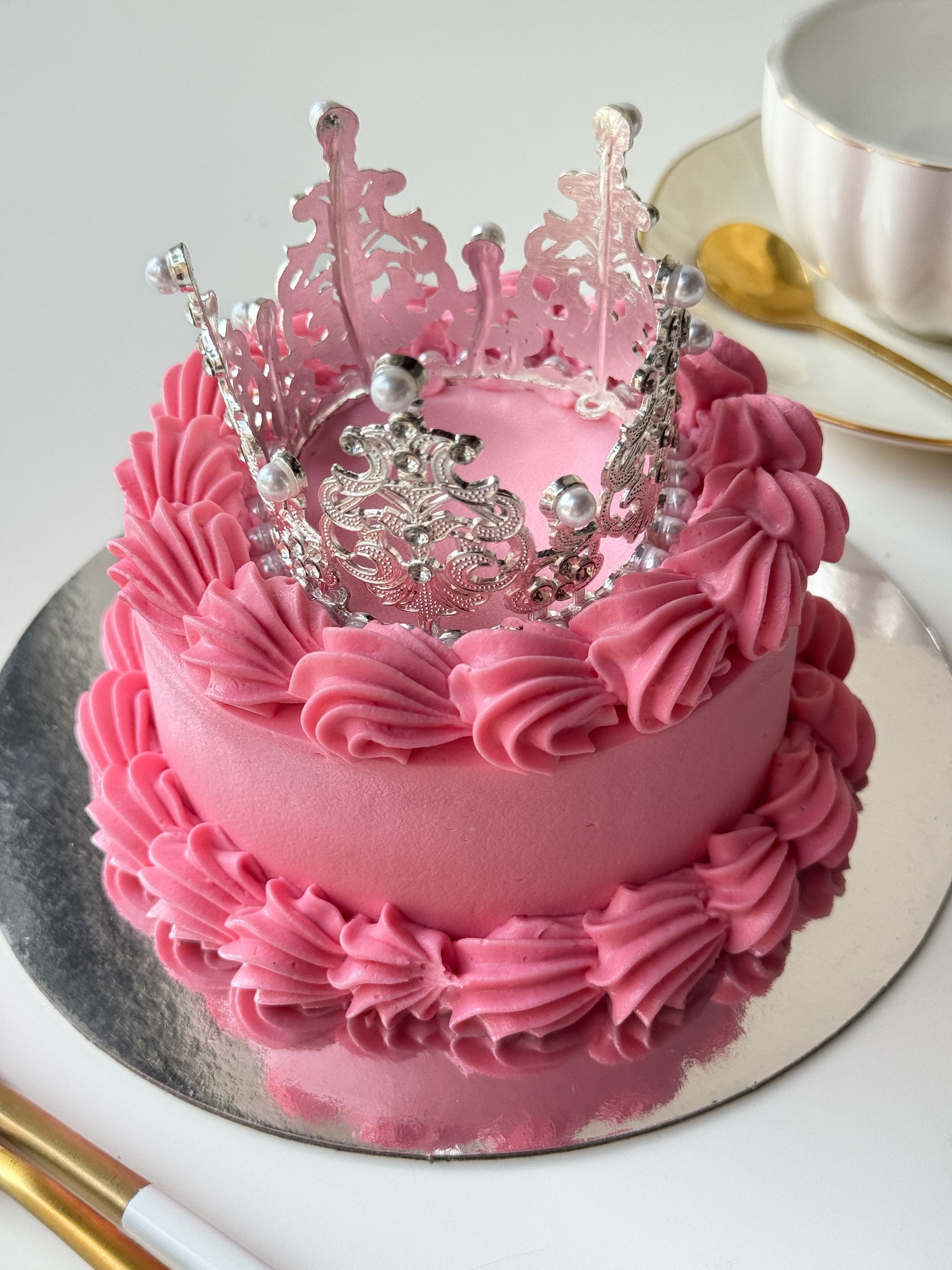 Бенто-торт «Принцесса» — нежный розовый крем, пышные завитки и съёмная серебристая корона. Идеален, когда хочется маленький, но по-настоящему королевский праздник.