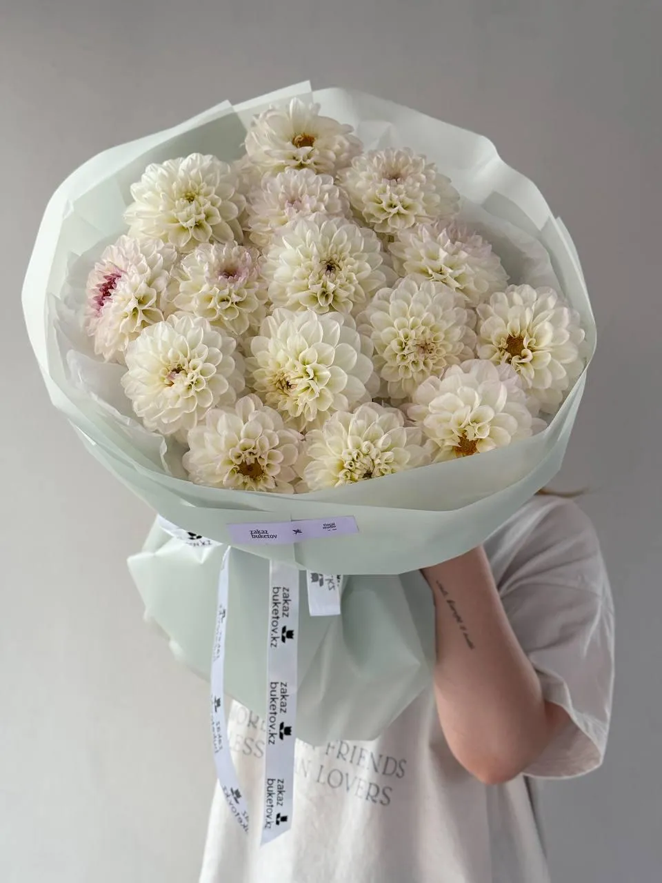 Белоснежные георгины с лёгким розовым оттенком собраны в стильной пастельно-зелёной упаковке и передают ощущение лёгкости, чистоты и душевного тепла.
