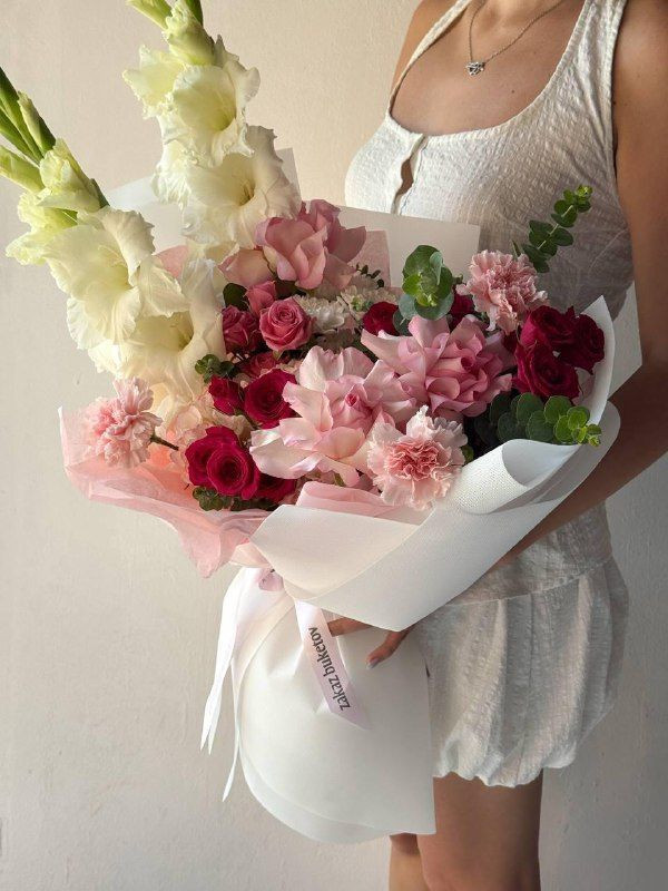 Букет "Августовский рассвет" — нежное сочетание утончённых оттенков и изысканных форм. Белоснежные гладиолусы придают композиции торжественность, а розовые и бордовые розы, гвоздики и георгины создают гармоничную палитру, полную тепла и романтики. Такой букет станет элегантным подарком, который выразит самые искренние чувства.