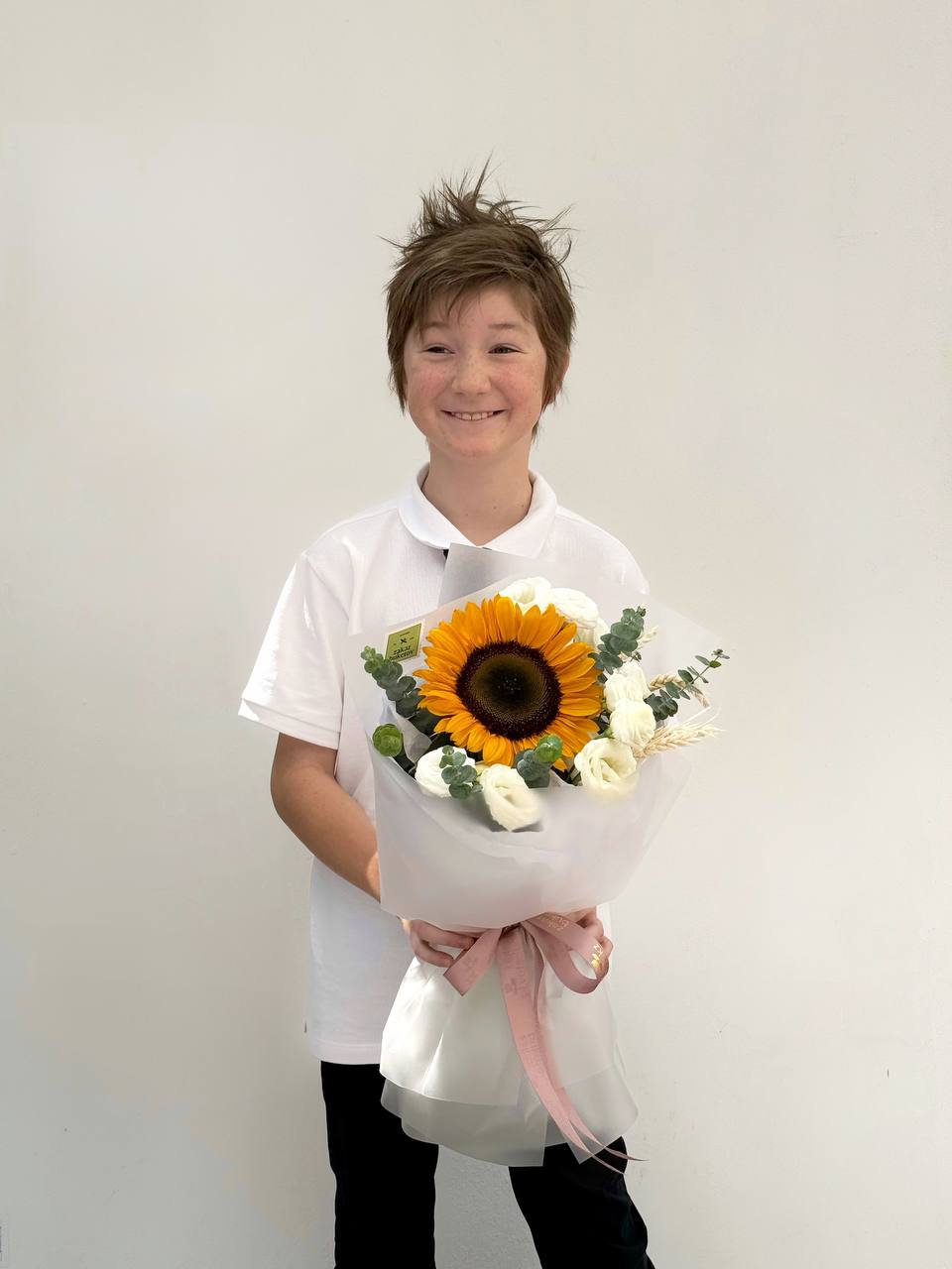Букет «Осеннее солнце» — яркий подсолнух с белыми эустомами и веточками эвкалипта в лёгкой упаковке. Тёплый и жизнерадостный букет, символизирующий начало нового сезона и солнечное настроение.
