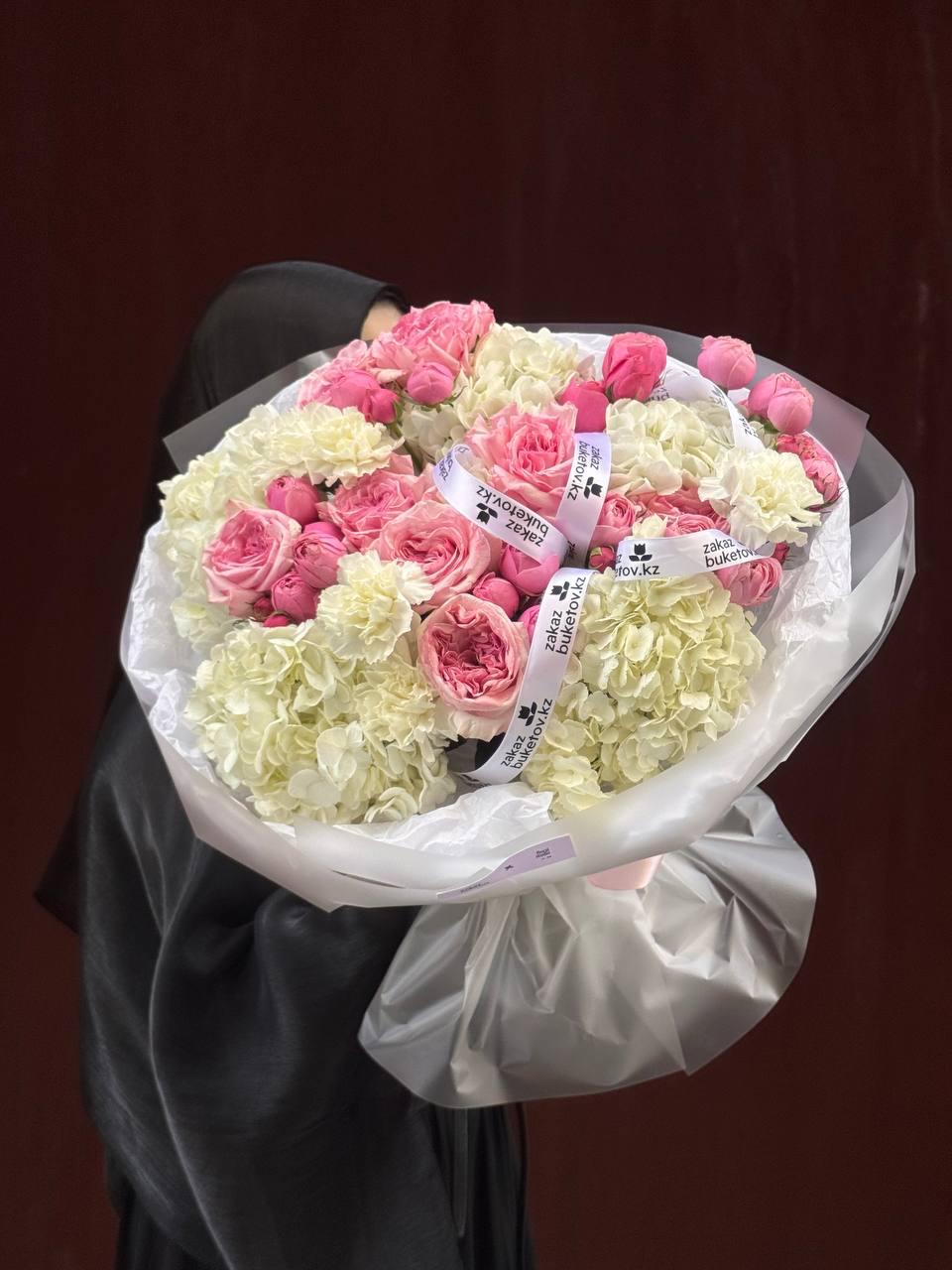 Состав: роза Охара, спрей роза пионовидная, гвоздика, гортензия.
