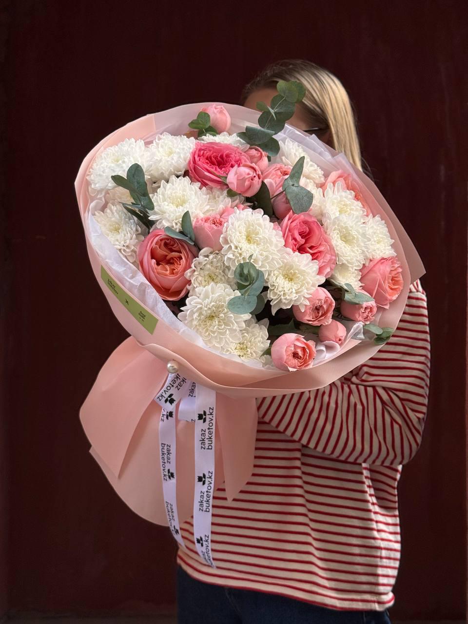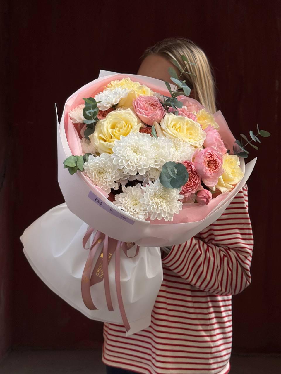 Нежные розы, воздушная хризантема и свежая зелень эвкалипта создают гармонию света и тепла. Универсальный букет, который подойдёт и для искреннего поздравления, и для тёплого знака внимания.