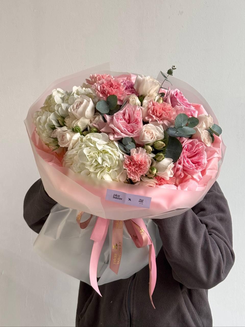 Состав: гортензия, гвоздика, роза, спрей роза, эвкалипт.