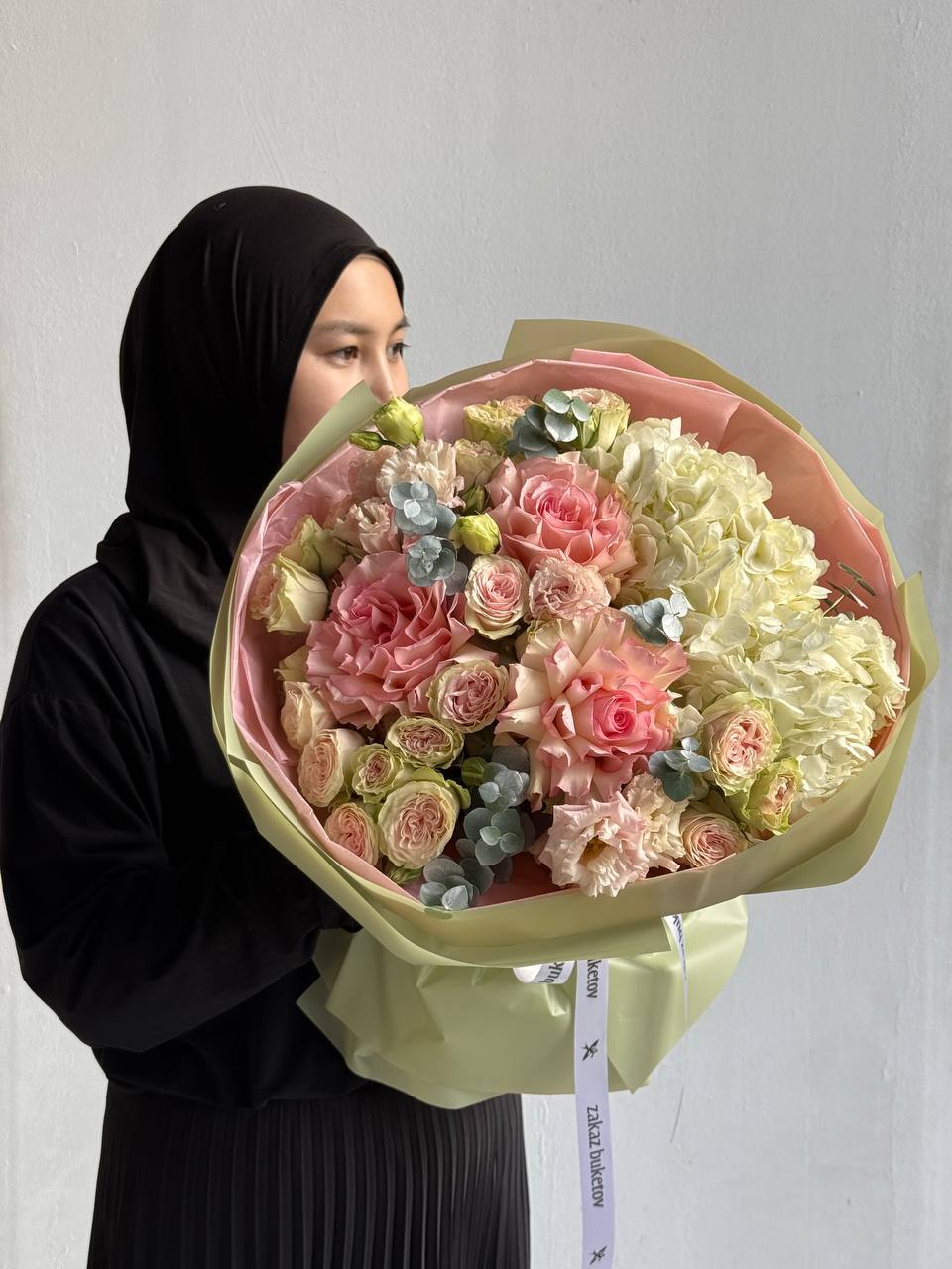 Изысканная композиция из пышных гортензий, бархатных роз, ранункулюсов и эвкалипта. Мягкая палитра кремовых и розовых тонов создаёт по-настоящему утончённый, романтичный образ. Букет выглядит объёмно, воздушно и идеально подойдёт для самых тёплых поздравлений.