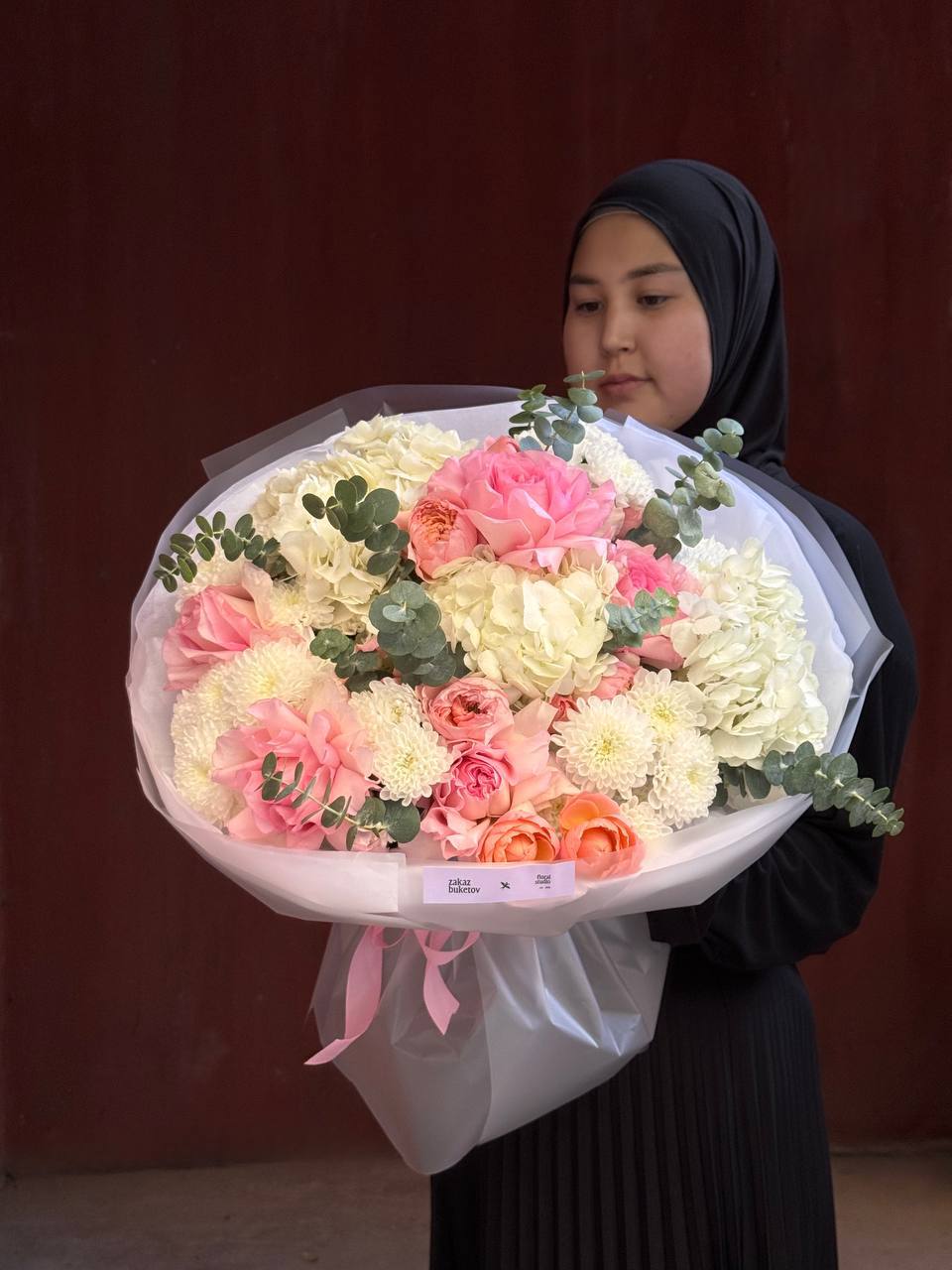 Большой нежный букет в пастельных оттенках — идеальный выбор для самых тёплых и искренних поздравлений. В композиции собраны роскошные пионовидные розы, воздушная гортензия, ароматные кустовые розы, хризантемы и свежий эвкалипт. Объёмная, гармоничная и очень нежная работа, оформленная в стильную плёнку с атласной лентой.
