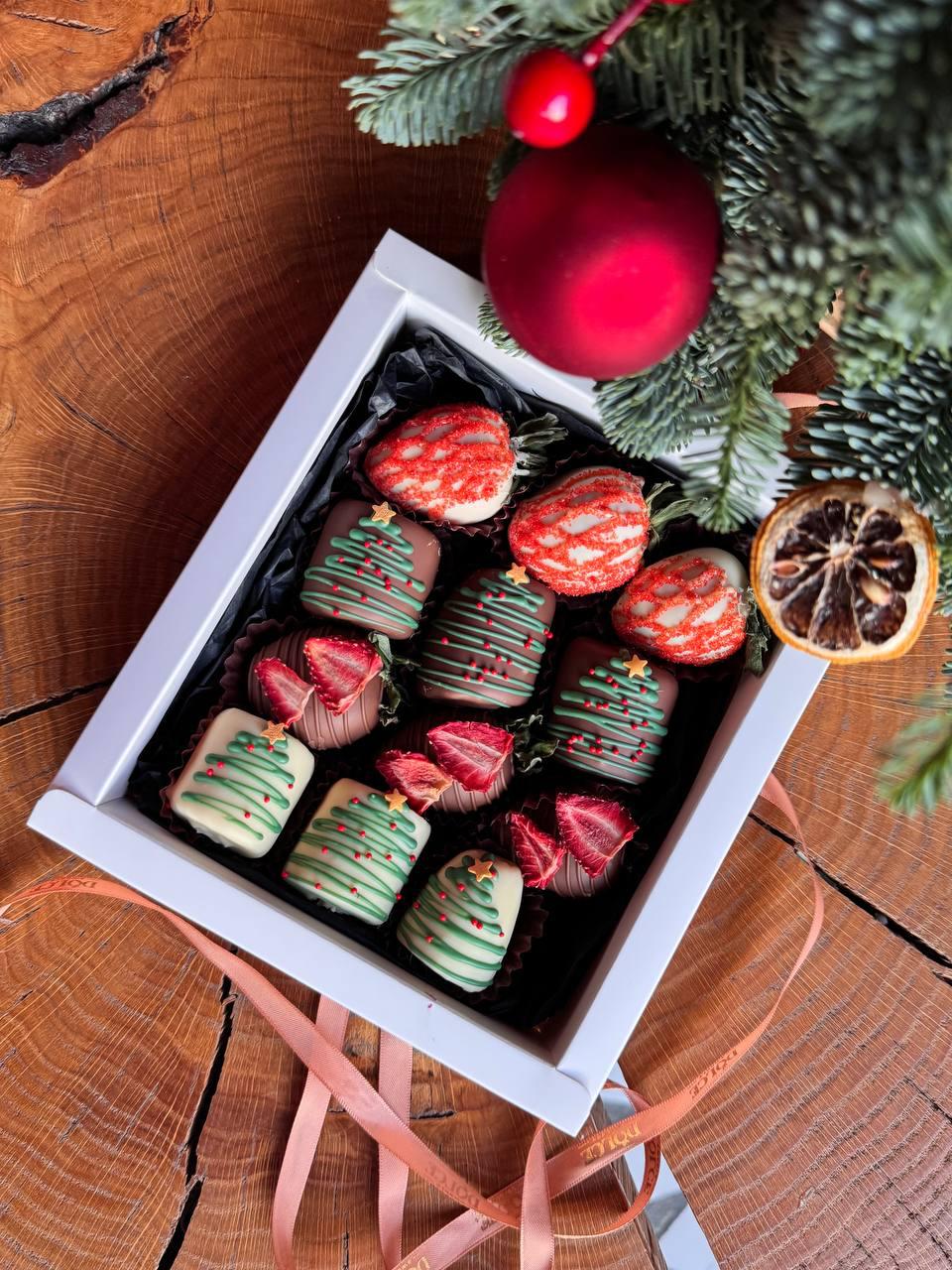 Праздничная коробочка с ягодами премиального качества: спелая клубника, украшенная хрустящим бельгийским шоколадом, новогодним декором и посыпкой. Внутри — ассорти из клубники в молочном, белом и тёмном шоколаде с тематическим дизайном в виде ёлочек, новогодних шаров и снежинок. Яркий, вкусный и атмосферный подарок, который создаёт настроение с первого взгляда.
