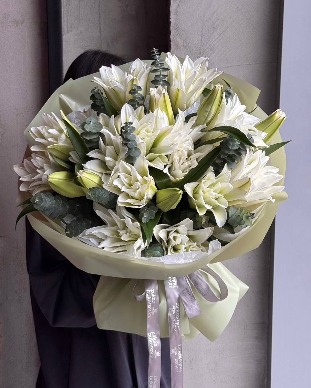 Букет «Лилиум» — это чистота, утончённость и благородная простота. Пышные пионовидные лилии создают объёмную и выразительную композицию, наполняя её лёгким ароматом и ощущением свежести. Акценты эвкалипта подчёркивают природную красоту цветов и добавляют букету современное, аккуратное звучание.