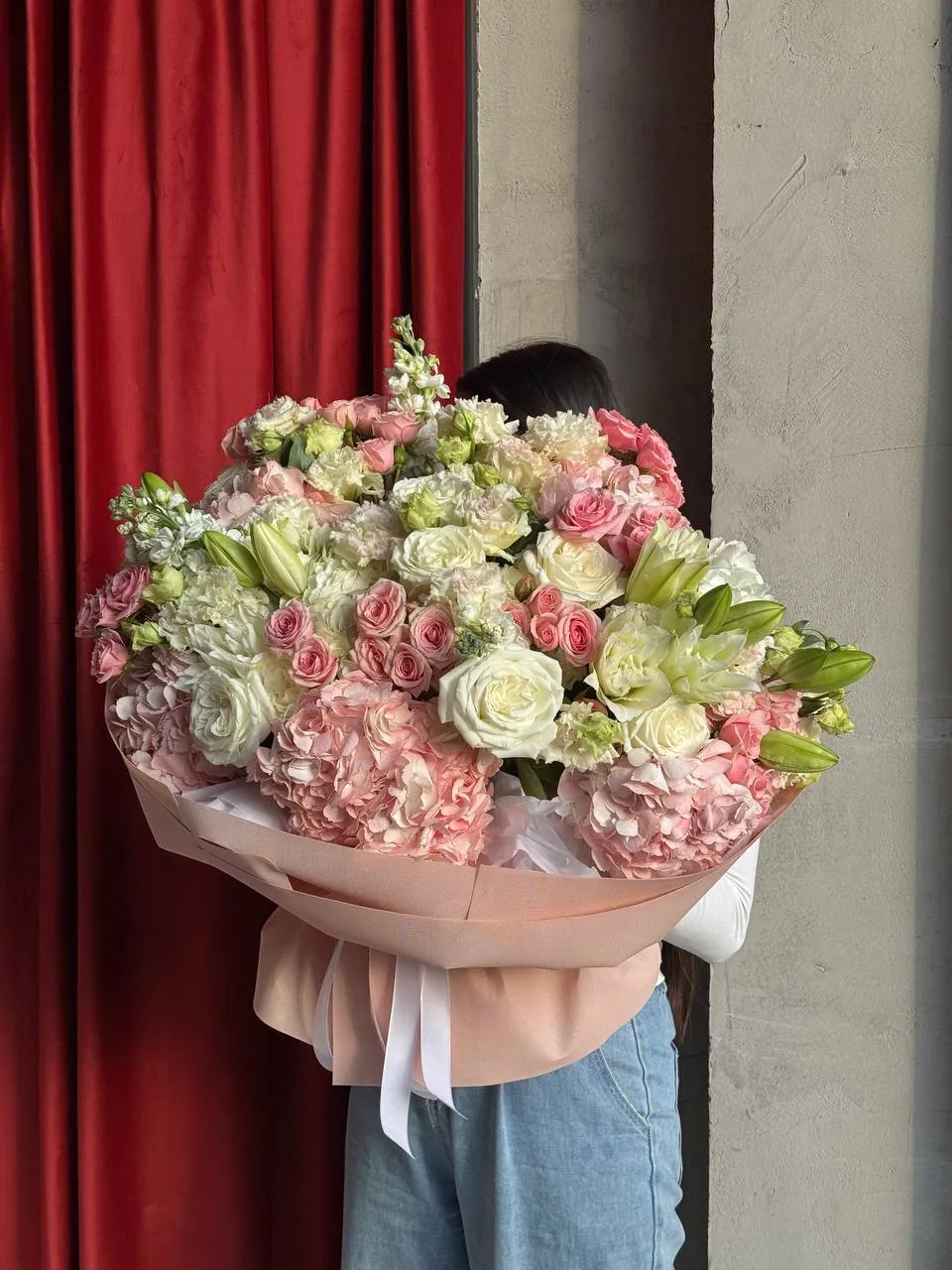 Букет «Тёплый рассвет» — это нежная и объёмная композиция, наполненная светом, теплом и утренней мягкостью оттенков. Пышные гортензии создают основу букета и придают ему воздушность, спрей-розы и голландские розы добавляют утончённую романтику, а лизиантус и маттиола наполняют композицию изяществом и глубиной. Пионовидные лилии становятся выразительным акцентом, делая букет по-настоящему роскошным и запоминающимся.