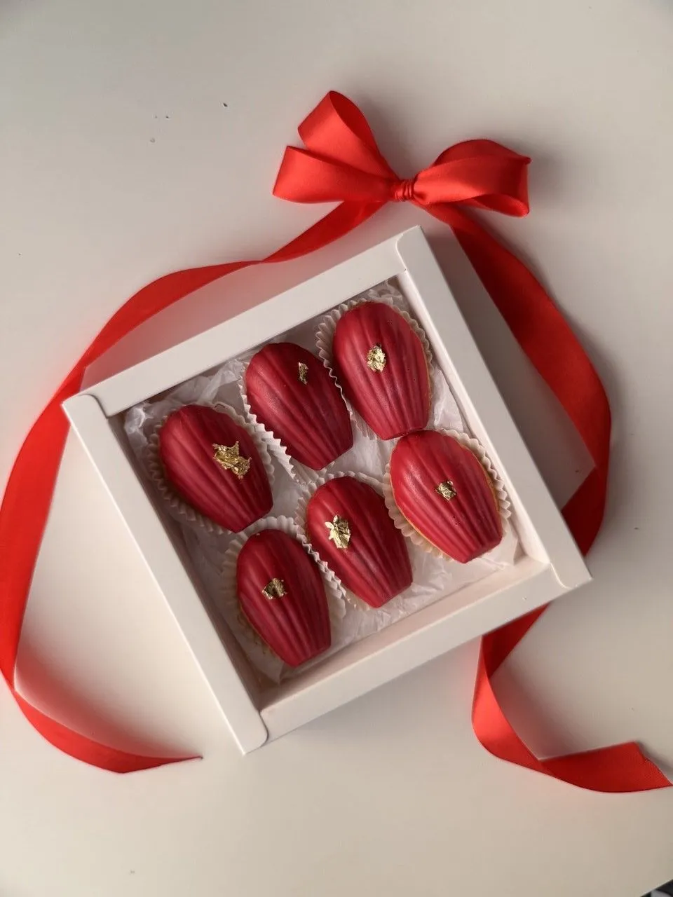 Набор мадленов «Алая любовь» — это элегантный и утончённый десерт, созданный для особенных моментов. Нежные мадлены выполнены в насыщенном алом оттенке и украшены изящным золотым декором, благодаря чему выглядят эффектно и по-праздничному. Этот набор сочетает в себе эстетику, вкус и внимание к деталям.