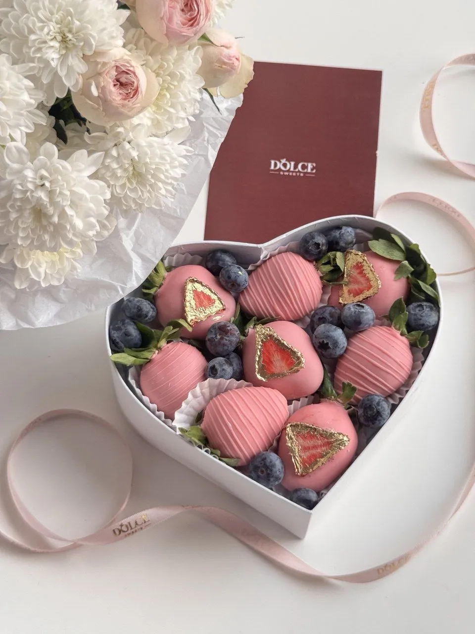 Клубника в шоколаде - 8; Ягодный декор - 1; Коробка сердце - 1; Открытка - 1;