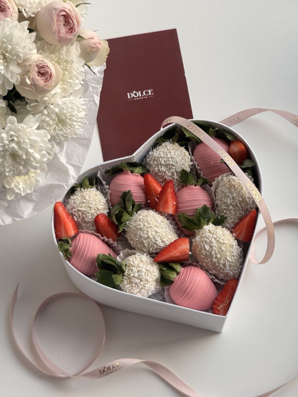 Клубничный бокс «My love» M — это нежный и элегантный сладкий подарок, созданный для искренних чувств. Свежая клубника в шоколаде аккуратно уложена в коробку в форме сердца и дополнена ягодным декором, создавая гармоничную и романтичную композицию. Формат M — идеальный баланс между эффектной подачей и изящной сдержанностью.