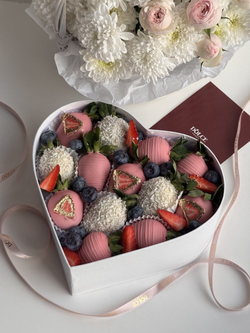 Клубничный бокс «My love» L — это эффектный и по-настоящему романтичный подарок, созданный для самых тёплых признаний. Свежая клубника в нежном шоколаде аккуратно уложена в коробку в форме сердца и дополнена ягодным декором, создавая роскошную и гармоничную композицию. Большой формат бокса делает подарок особенно впечатляющим и запоминающимся.