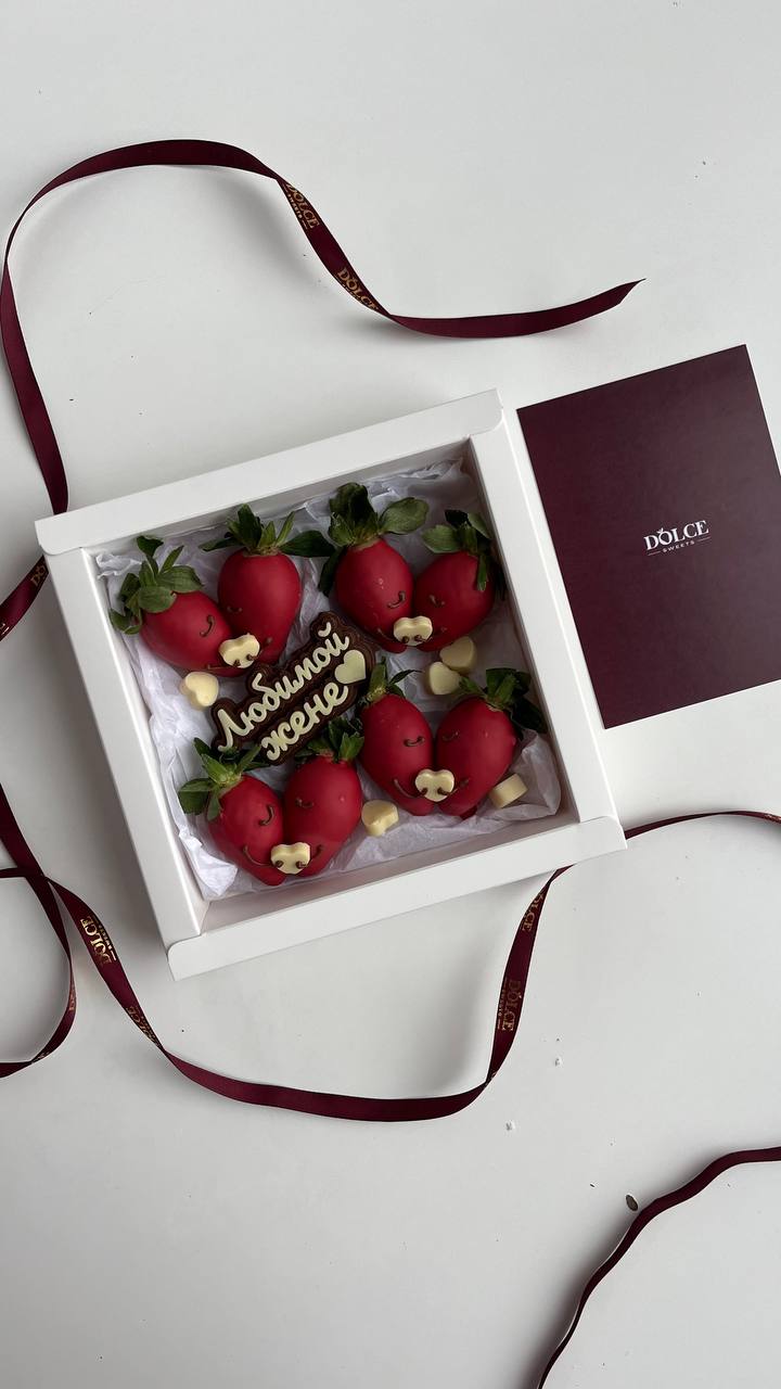 Клубника в шоколаде - 8; Шоколадная надпись - 1; Шоколадный декор 0,5 гр - 9; Коробочка для клубники - 1; Открытка - 1;