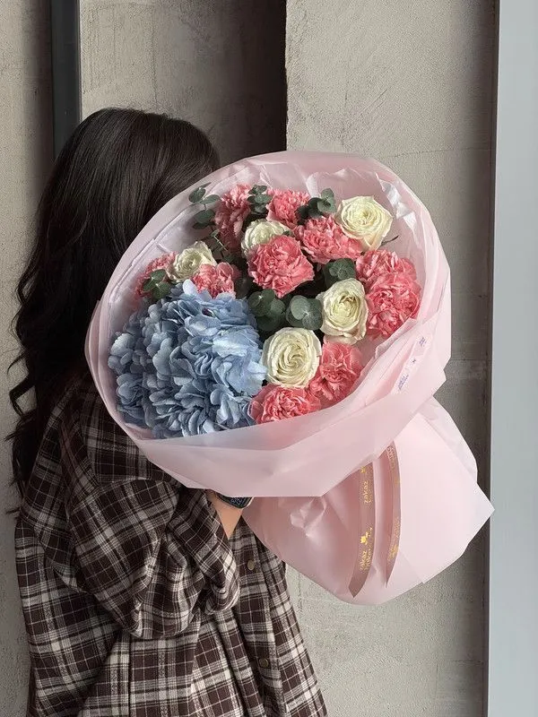 Букет «Клео» — это изысканная композиция, в которой нежность сочетается с выразительным характером. Воздушная голубая гортензия создаёт ощущение лёгкости и свежести, голландские розы добавляют элегантности, а гвоздики формируют мягкий объём и гармоничную текстуру. Акценты эвкалипта подчёркивают природную свежесть букета и делают композицию визуально сбалансированной.
