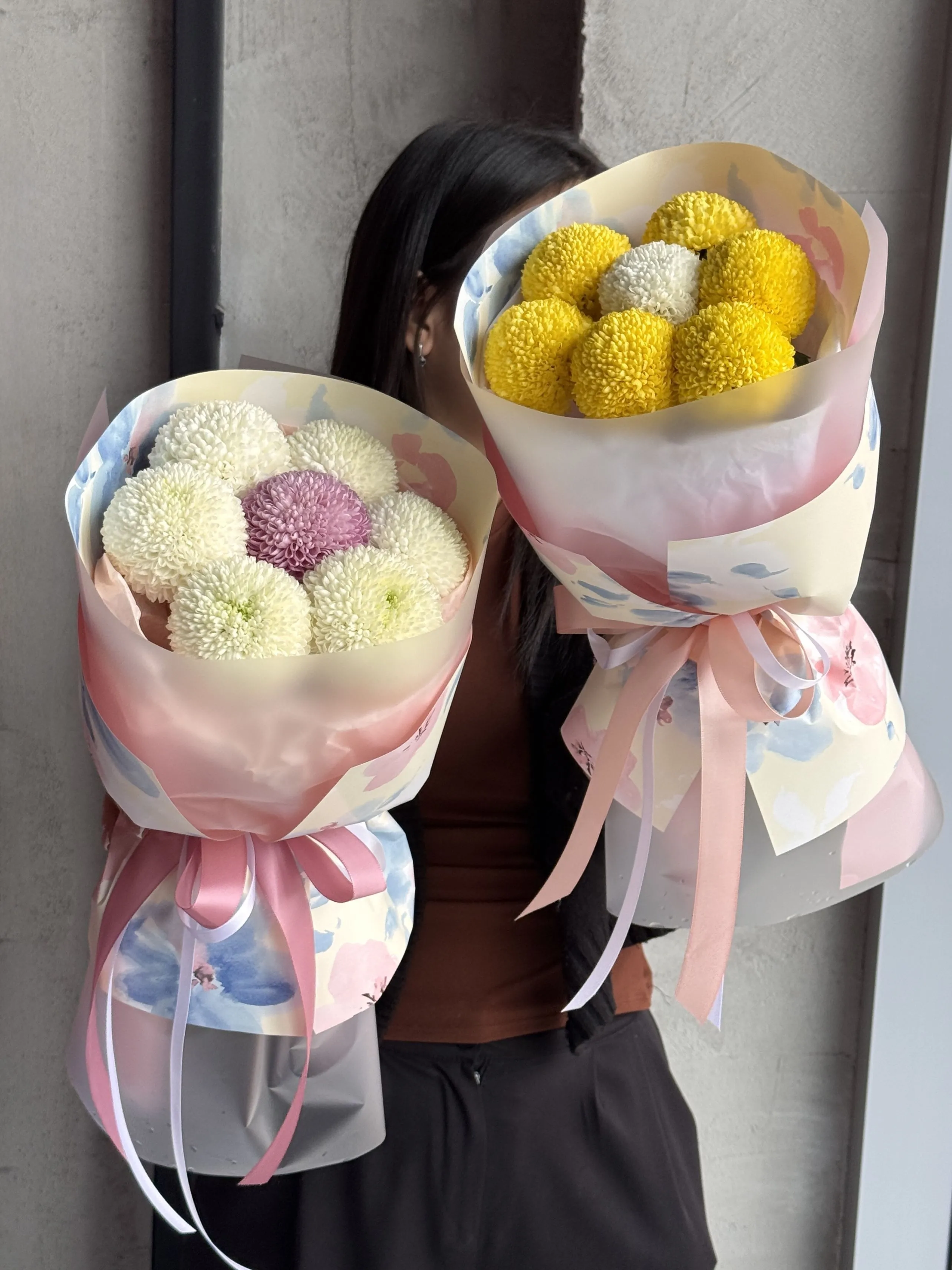 Букет «Цветок Момоки» — это про чистоту, гармонию и спокойную радость. Одиночные хризантемы собраны в аккуратную, округлую форму и выглядят как живой арт-объект. Контрастные оттенки — нежные молочные и солнечно-жёлтые — создают ощущение света, уюта и лёгкости.
