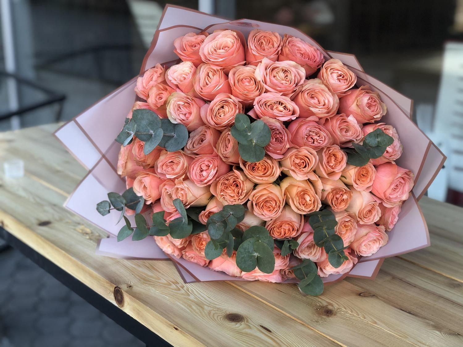 Пионовидная роза (Англия) - 61; Эвкалипт (Голландия) - 5; Калька в ассортименте - 6; Открытка - 1; Шпажка для открытки - 1;