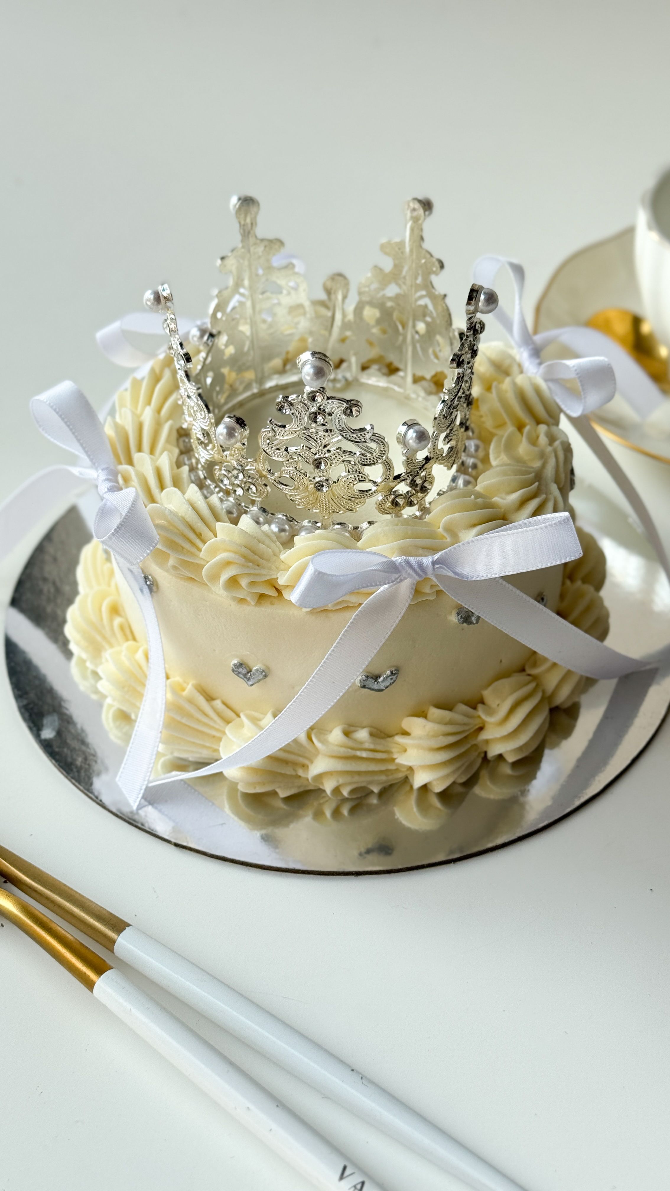 «Белая корона» — белоснежное покрытие и пышные завитки из нежного сливочного крема, серебристая корона с жемчужинами, аккуратные белые бантики и мини-сердечки. Компактный, нарядный и очень нежный — идеален для дня рождения и «королевских» сюрпризов. - для белого