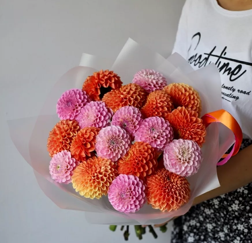 Моно букет из георгинов в оформлении. Если Вы хотите подарить незабываемые эмоции дорогому человеку — закажите доставку цветов в Zakazbuketovkz