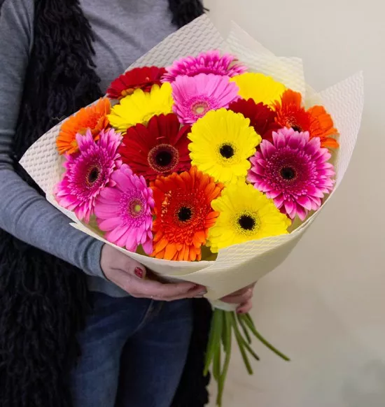 Моно букет из 15 гербер в оформлении. Если Вы хотите подарить незабываемые эмоции дорогому человеку — закажите доставку цветов в Zakazbuketovkz