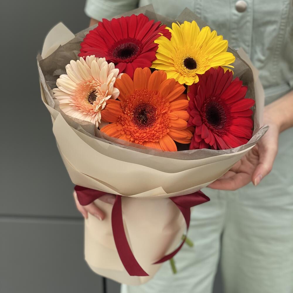 Моно букет из 5 гербер в оформлении. Если Вы хотите подарить незабываемые эмоции дорогому человеку — закажите доставку цветов в Zakazbuketovkz